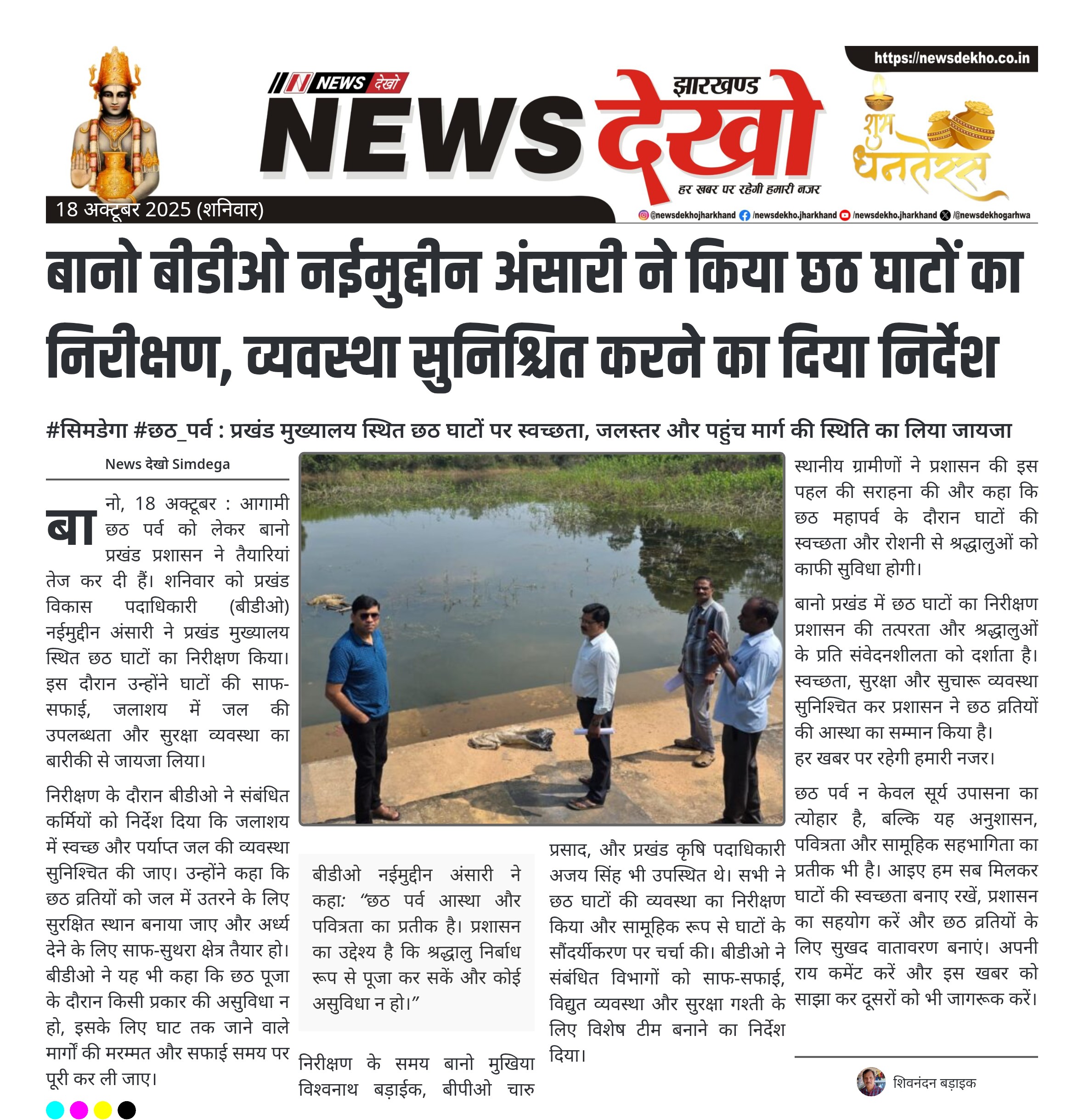 #सिमडेगा #छठ_पर्व : प्रखंड मुख्यालय स्थित छठ घाटों पर स्वच्छता, जलस्तर और पहुंच मार्ग की स्थिति का लिया जायजा प्रखंड विकास पदाधिकारी नईमुद्दीन अंसारी ने किया छठ घाटों का निरीक्षण। जलाशय में स्वच्छ जल और जलस्तर की स्थिति का लिया जायजा। व्रतियों के लिए अर्ध्य स्थल और पहुंच मार्ग की तैयारी पर दिया जोर। निरीक्षण में मुखिया विश्वनाथ बड़ाईक, बीपीओ चारु प्रसाद और कृषि पदाधिकारी अजय सिंह रहे उपस्थित। छठ पूजा के मद्देनजर सभी विभागों को सौंपे गए आवश्यक निर्देश।…