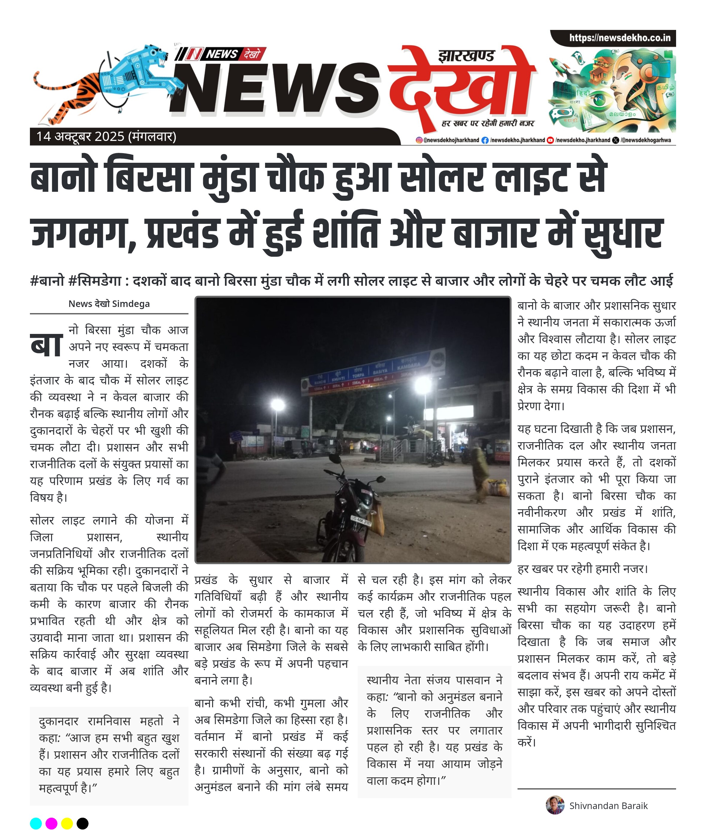 #बानो #सिमडेगा : दशकों बाद बानो बिरसा मुंडा चौक में लगी सोलर लाइट से बाजार और लोगों के चेहरे पर चमक लौट आई बानो बिरसा मुंडा चौक में दशकों बाद सोलर लाइट लगाई गई। सभी दुकानदारों और स्थानीय लोगों ने प्रशासन और राजनीतिक दलों को धन्यवाद दिया। प्रशासन की कार्रवाई के बाद प्रखंड में शांति और सुरक्षा की स्थिति बनी हुई है। बानो प्रखंड की बाजार व्यवस्था में सुधार और सरकारी संस्थानों की बढ़ोतरी हुई। ट्रेन लाइन के माध्यम से…