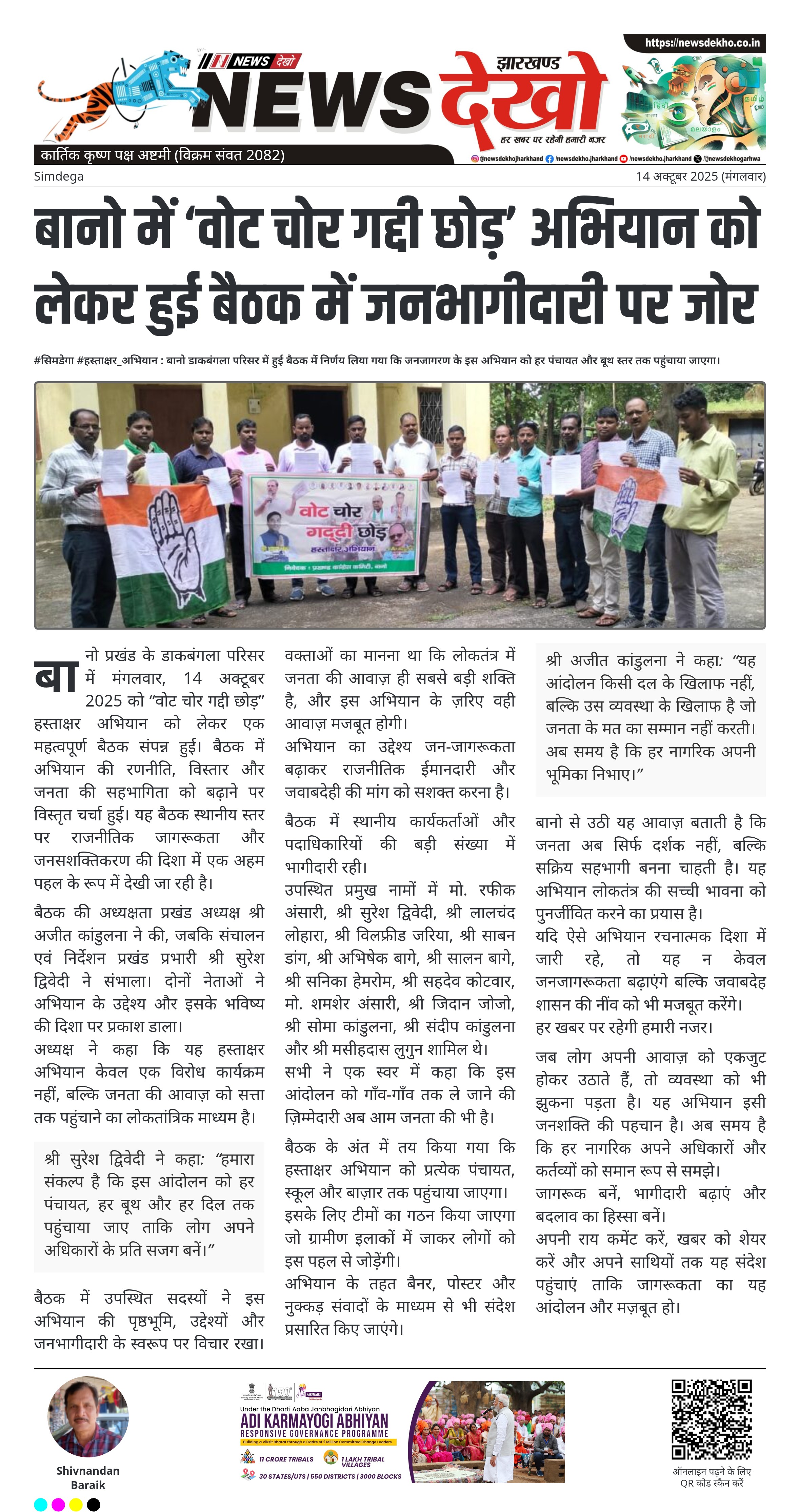 #सिमडेगा #हस्ताक्षर_अभियान : बानो डाकबंगला परिसर में हुई बैठक में निर्णय लिया गया कि जनजागरण के इस अभियान को हर पंचायत और बूथ स्तर तक पहुंचाया जाएगा। दिनांक 14 अक्टूबर 2025 को बानो डाकबंगला परिसर में बैठक आयोजित हुई। बैठक की अध्यक्षता अजीत कांडुलना और संचालन सुरेश द्विवेदी ने किया। चर्चा का केंद्र रहा ‘वोट चोर गद्दी छोड़’ हस्ताक्षर अभियान। वक्ताओं ने जनभागीदारी और जागरूकता बढ़ाने पर जोर दिया। बैठक में कई प्रखंड पदाधिकारी और कार्यकर्ता उपस्थित रहे। बानो प्रखंड…