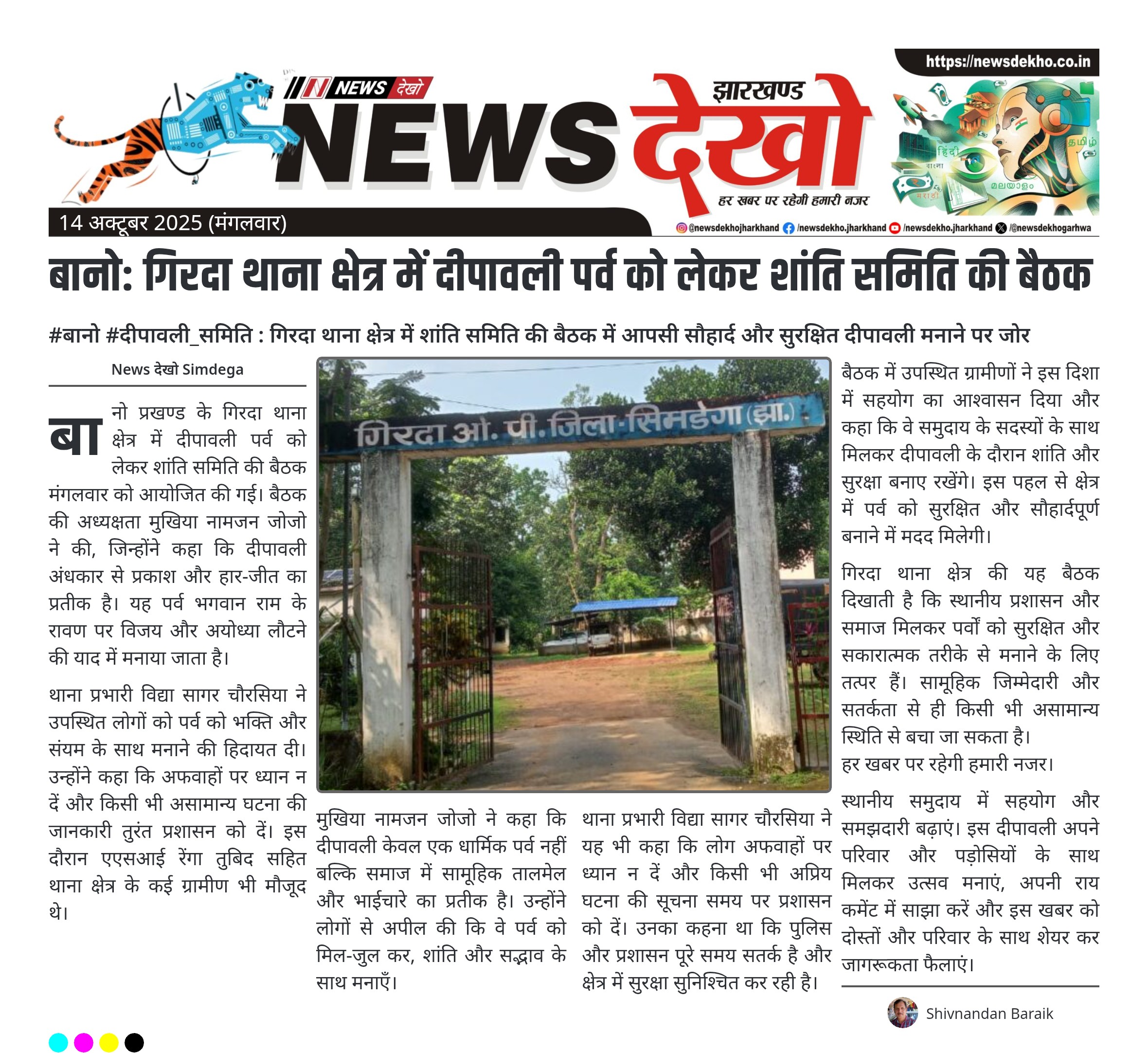 #बानो #दीपावली_समिति : गिरदा थाना क्षेत्र में शांति समिति की बैठक में आपसी सौहार्द और सुरक्षित दीपावली मनाने पर जोर बानो प्रखण्ड के गिरदा थाना क्षेत्र में दीपावली पर्व को लेकर शांति समिति की बैठक। बैठक की अध्यक्षता मुखिया नामजन जोजो ने की। थाना प्रभारी विद्या सागर चौरसिया ने भक्ति और संयमपूर्वक पर्व मनाने का निर्देश दिया। एएसआई रेंगा तुबिद सहित ग्रामीण भी बैठक में मौजूद। पर्व पर अफवाहों से बचने और किसी भी घटना की सूचना समय पर प्रशासन…