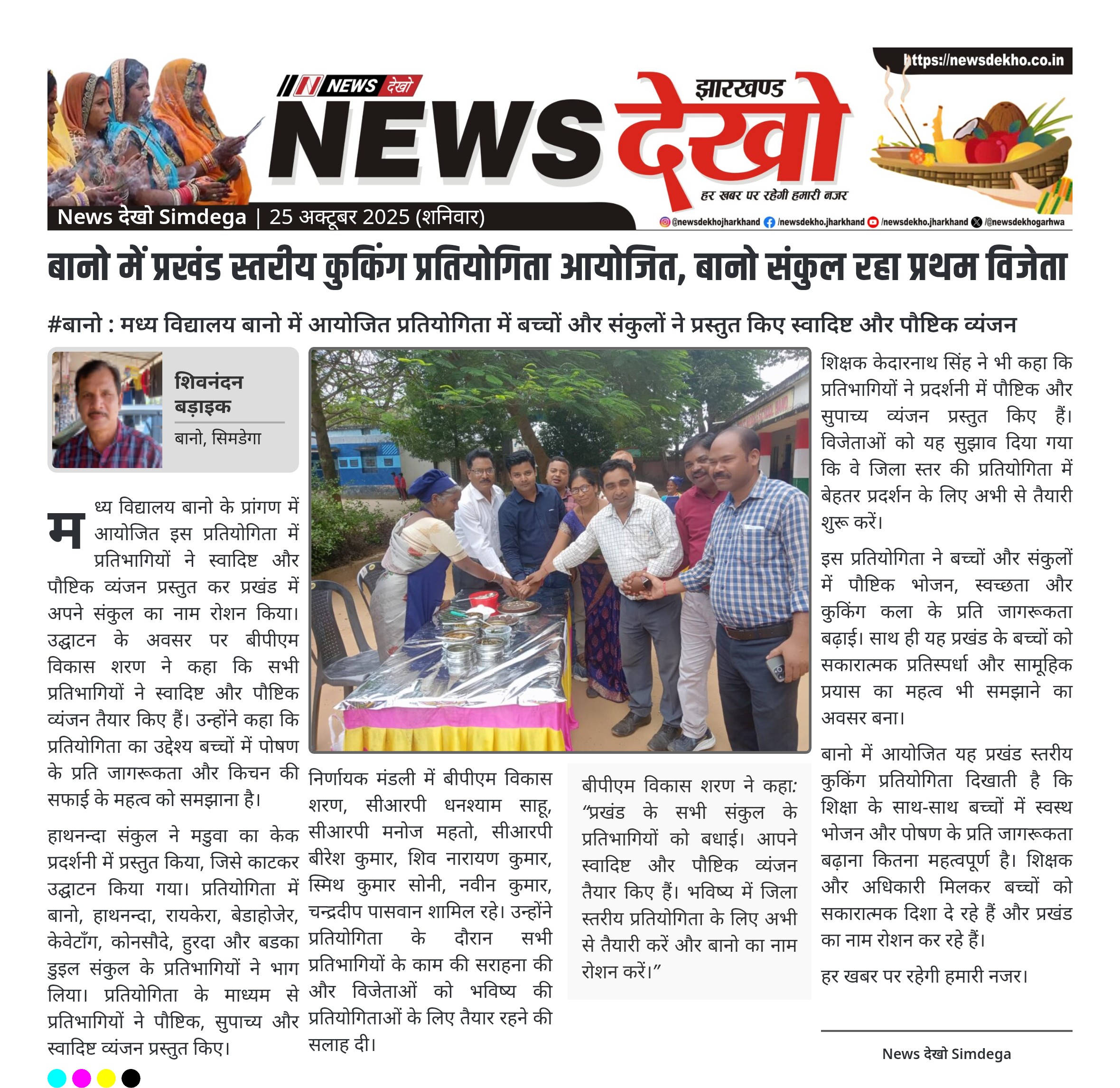 #बानो : मध्य विद्यालय बानो में आयोजित प्रतियोगिता में बच्चों और संकुलों ने प्रस्तुत किए स्वादिष्ट और पौष्टिक व्यंजन प्रखंड स्तरीय कुकिंग प्रतियोगिता का आयोजन मध्य विद्यालय बानो के प्रांगण में किया गया। प्रतियोगिता में बानो, हाथनन्दा, रायकेरा, बेडाहोजेर, केवेटाँग, कोनसौदे, हुरदा, बडका डुइल संकुल के प्रतिभागियों ने भाग लिया। प्रथम स्थान बानो संकुल, दूसरा हाथनन्दा संकुल, और तृतीय स्थान रायकेरा संकुल के प्रतिभागियों को मिला। कार्यक्रम का उद्घाटन बीपीएम विकास शरण ने मडुवा केक काटकर किया। प्रतियोगिता का उद्देश्य…