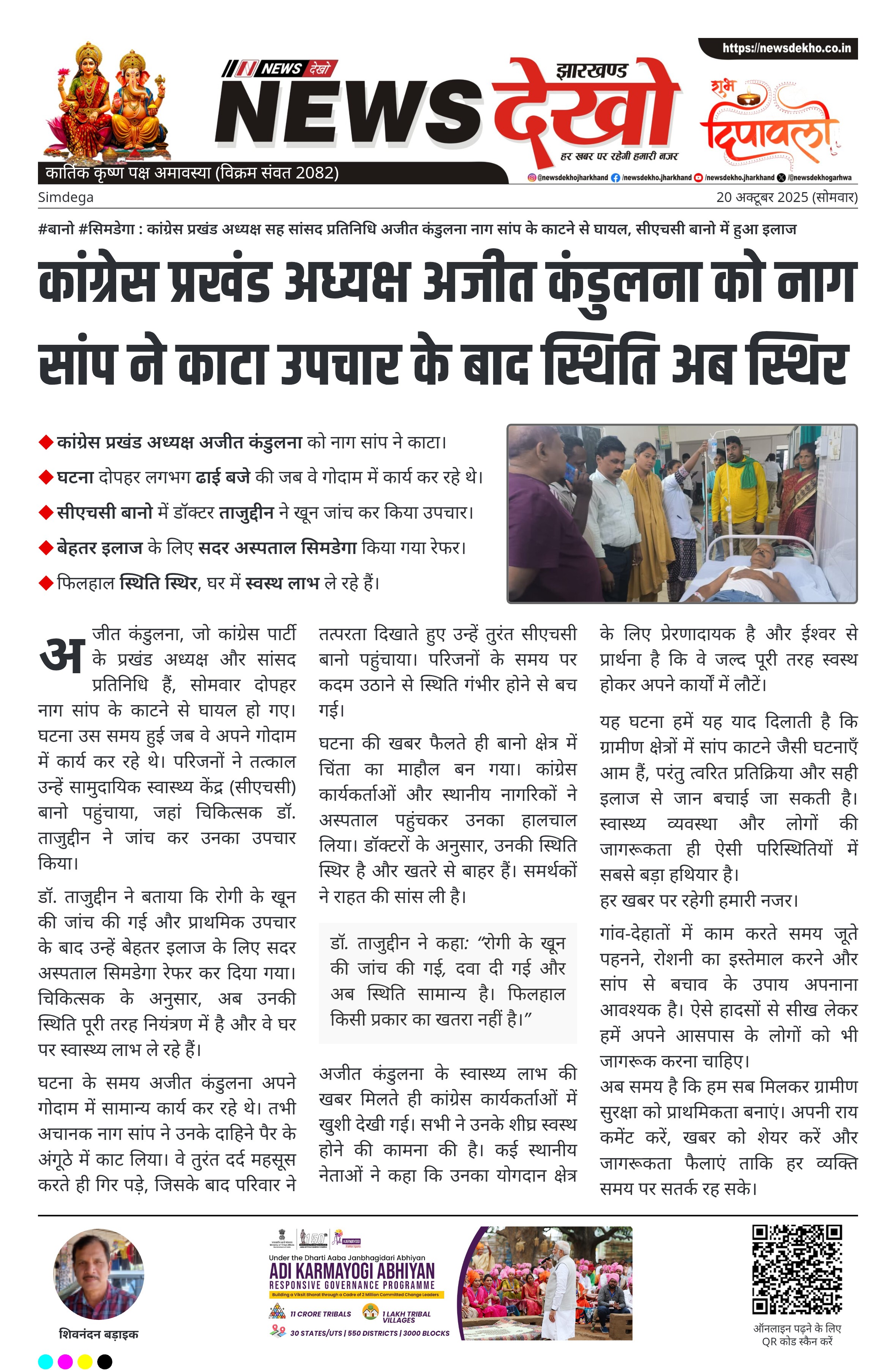 कांग्रेस प्रखंड अध्यक्ष अजीत कंडुलना को नाग सांप ने काटा उपचार के बाद स्थिति अब स्थिर
