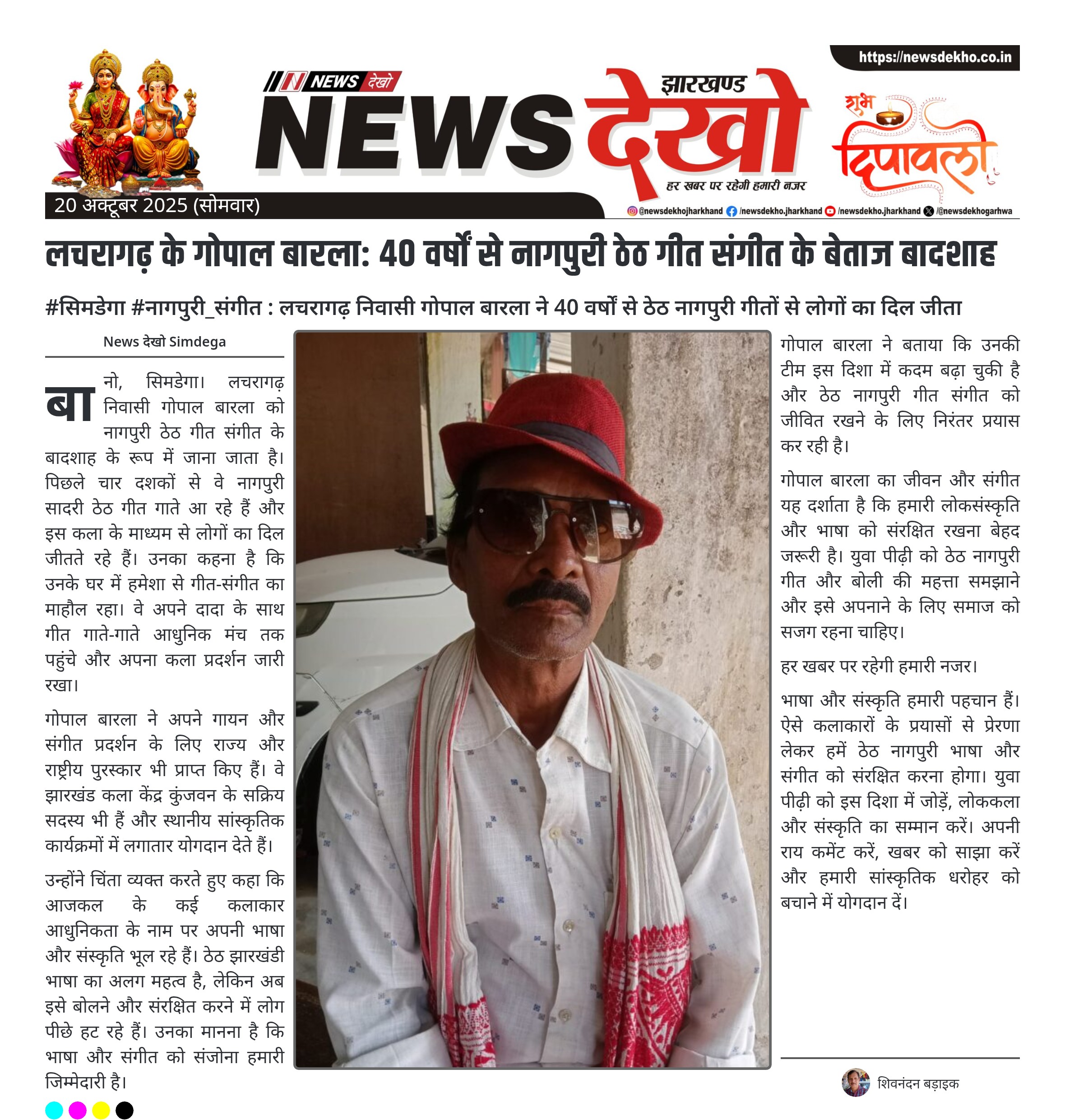 #सिमडेगा #नागपुरी_संगीत : लचरागढ़ निवासी गोपाल बारला ने 40 वर्षों से ठेठ नागपुरी गीतों से लोगों का दिल जीता गोपाल बारला, लचरागढ़ के नागपुरी गायक और आयुर्वेद विशेषज्ञ। पिछले 40 वर्षों से नागपुरी सादरी ठेठ गीत गा कर लोकप्रिय। गीत संगीत के लिए राज्य और राष्ट्रीय स्तर पर पुरस्कार प्राप्त। झारखंड कला केंद्र कुंजवन के सक्रिय सदस्य। आधुनिक गीत संगीत के नाम पर भाषा और संस्कृति की अनदेखी पर चिंता व्यक्त। ठेठ नागपुरी भाषा और गीत-संगीत को संजोने और संरक्षित…