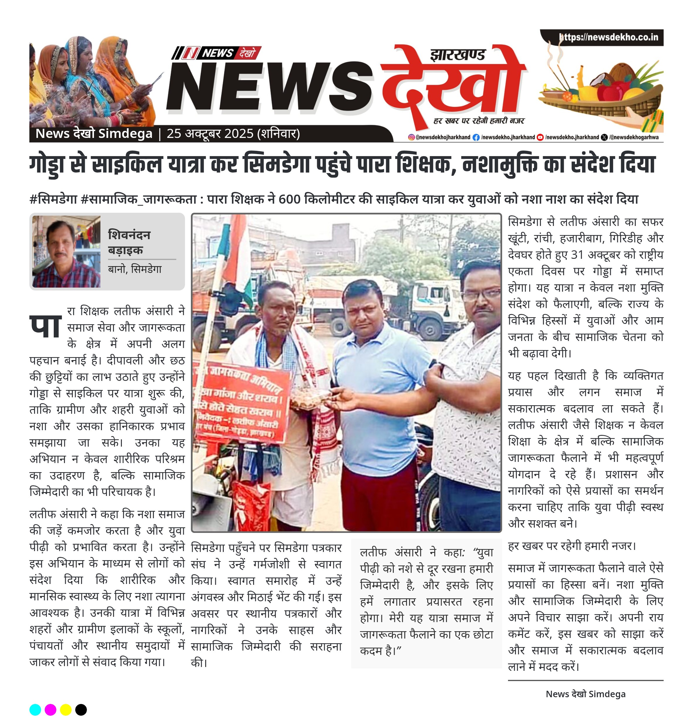 #सिमडेगा #सामाजिक_जागरूकता : पारा शिक्षक ने 600 किलोमीटर की साइकिल यात्रा कर युवाओं को नशा नाश का संदेश दिया पारा शिक्षक लतीफ अंसारी ने 17 अक्टूबर को गोड्डा से साइकिल यात्रा शुरू की और 600 किलोमीटर की दूरी तय कर सिमडेगा पहुंचे। उनकी यात्रा का मुख्य उद्देश्य समाज में नशा मुक्ति और जागरूकता फैलाना था। यात्रा में दुमका, जामताड़ा, धनबाद, बोकारो, रामगढ़, लोहरदगा और गुमला जैसे जिले शामिल थे। सिमडेगा में पत्रकार संघ ने उनका स्वागत अंगवस्त्र और मिठाई देकर…