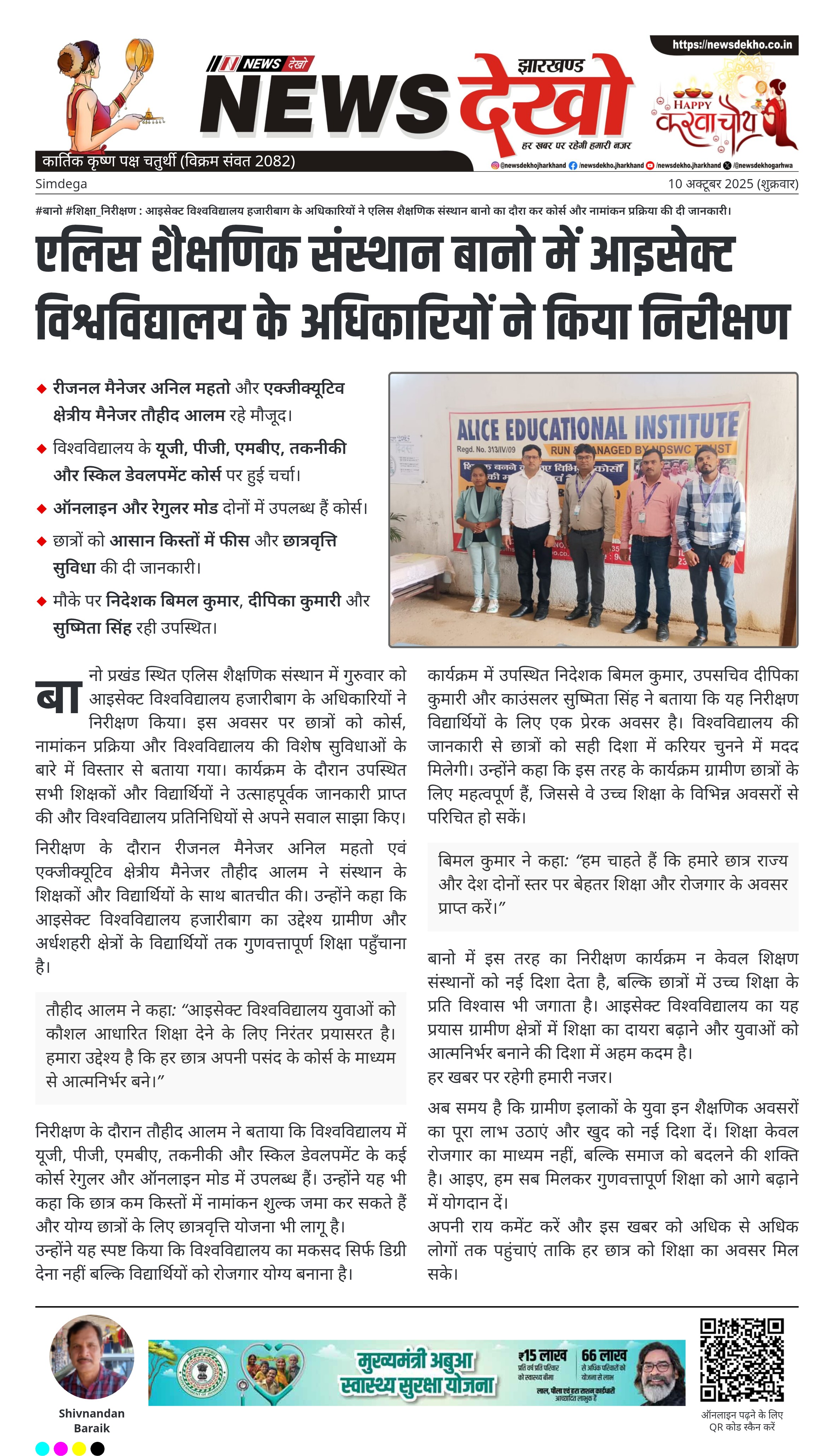 #बानो #शिक्षा_निरीक्षण : आइसेक्ट विश्वविद्यालय हजारीबाग के अधिकारियों ने एलिस शैक्षणिक संस्थान बानो का दौरा कर कोर्स और नामांकन प्रक्रिया की दी जानकारी। एलिस शैक्षणिक संस्थान बानो में हुआ आइसेक्ट विश्वविद्यालय का निरीक्षण। रीजनल मैनेजर अनिल महतो और एक्जीक्यूटिव क्षेत्रीय मैनेजर तौहीद आलम रहे मौजूद। विश्वविद्यालय के यूजी, पीजी, एमबीए, तकनीकी और स्किल डेवलपमेंट कोर्स पर हुई चर्चा। ऑनलाइन और रेगुलर मोड दोनों में उपलब्ध हैं कोर्स। छात्रों को आसान किस्तों में फीस और छात्रवृत्ति सुविधा की दी जानकारी। मौके…