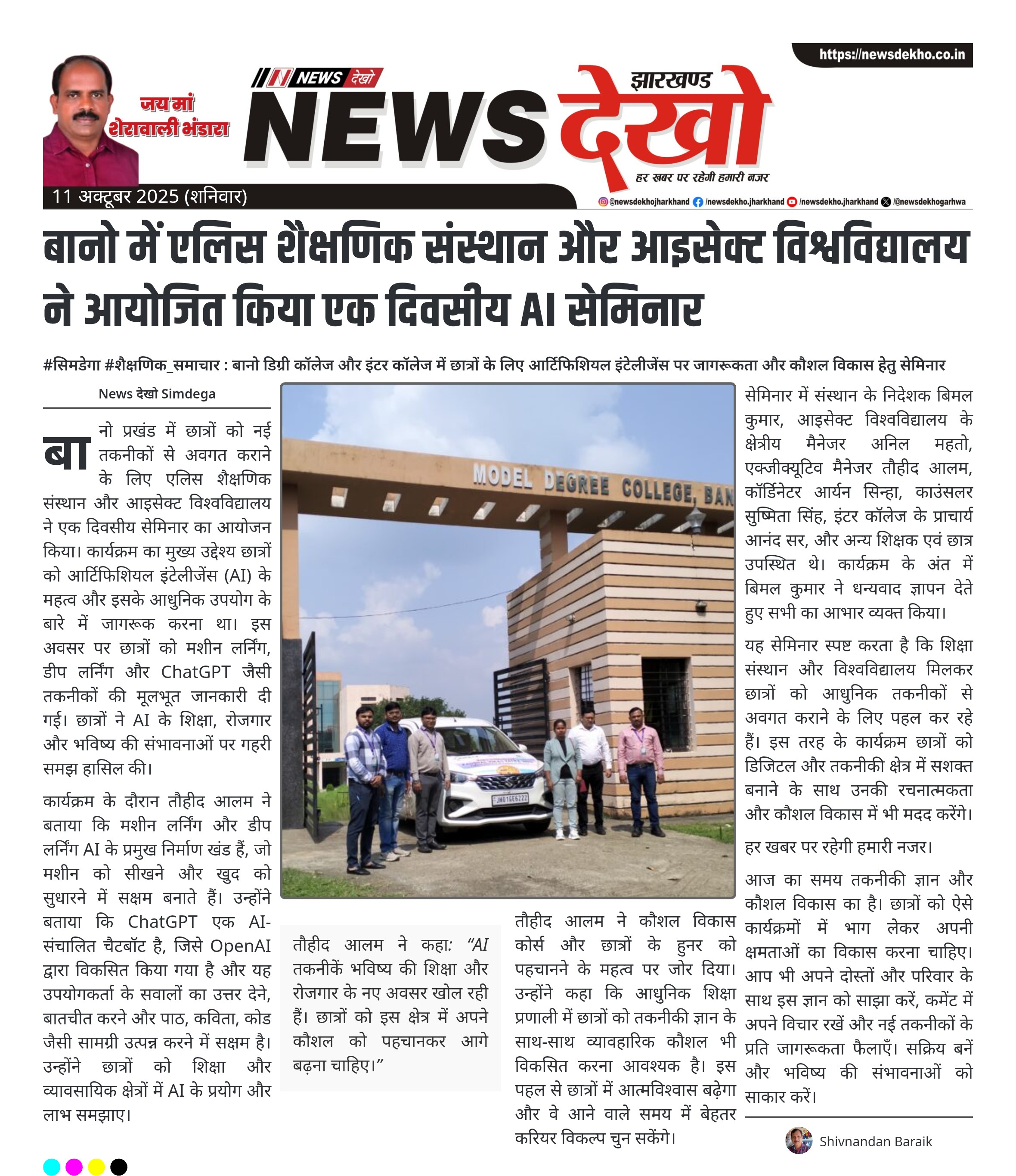 #सिमडेगा #शैक्षणिक_समाचार : बानो डिग्री कॉलेज और इंटर कॉलेज में छात्रों के लिए आर्टिफिशियल इंटेलीजेंस पर जागरूकता और कौशल विकास हेतु सेमिनार एलिस शैक्षणिक संस्थान और आइसेक्ट विश्वविद्यालय ने बानो में AI सेमिनार आयोजित किया। सेमिनार का आयोजन बानो डिग्री कॉलेज एवं इंटर कॉलेज में किया गया। तौहीद आलम ने छात्रों को मशीन लर्निंग, डीप लर्निंग और ChatGPT जैसी AI तकनीकों के बारे में जानकारी दी। छात्रों को कौशल विकास कोर्स और अपने हुनर को पहचानने के महत्व पर मार्गदर्शन…