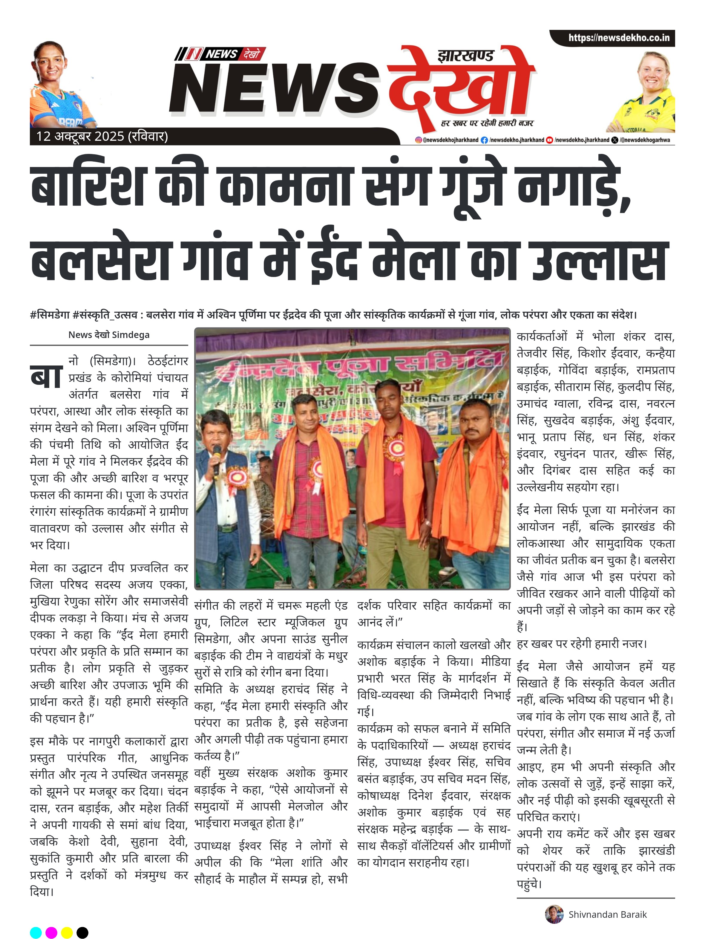 #सिमडेगा #संस्कृति_उत्सव : बलसेरा गांव में अश्विन पूर्णिमा पर ईंद्रदेव की पूजा और सांस्कृतिक कार्यक्रमों से गूंजा गांव, लोक परंपरा और एकता का संदेश। ठेठईटांगर प्रखंड के बलसेरा गांव में पारंपरिक ईंद मेला धूमधाम से सम्पन्न हुआ। अश्विन पूर्णिमा की पंचमी तिथि पर ग्रामीणों ने ईंद्रदेव की पूजा कर अच्छी फसल और बारिश की कामना की। मुख्य अतिथि अजय एक्का, मुखिया रेणुका सोरेंग और समाजसेवी दीपक लकड़ा ने दीप प्रज्वलित कर कार्यक्रम का उद्घाटन किया। नागपुरी कलाकारों ने गीत-संगीत और…