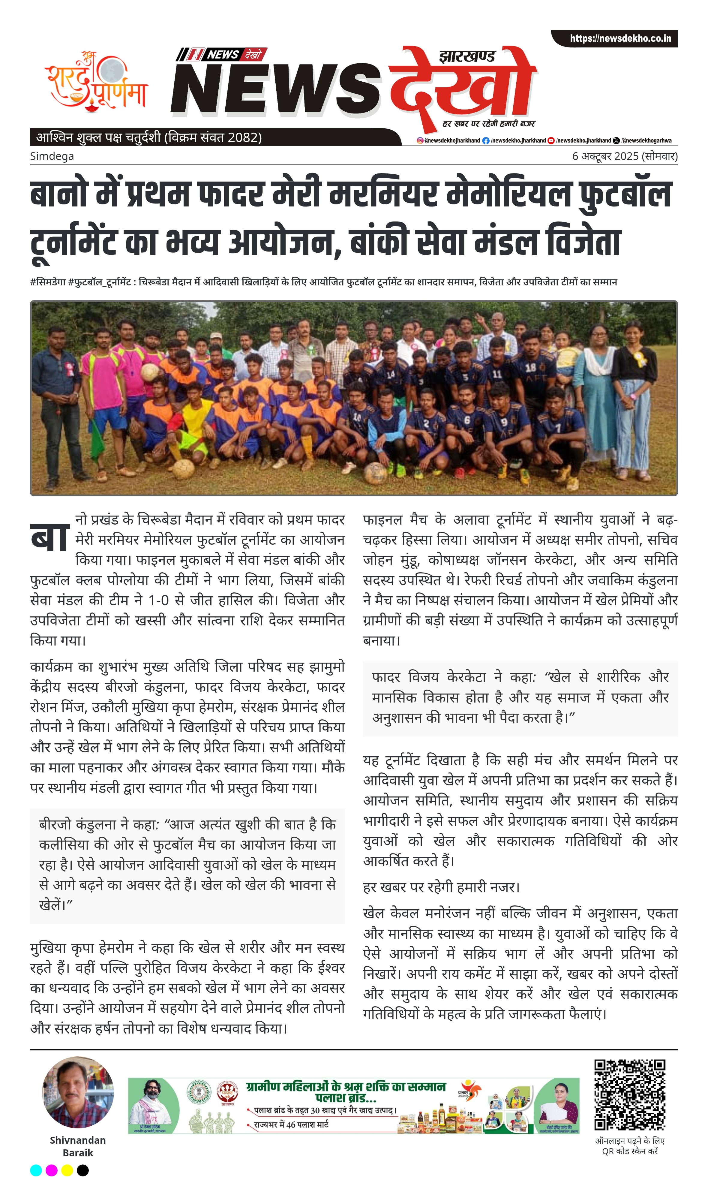 #सिमडेगा #फुटबॉल_टूर्नामेंट : चिरूबेडा मैदान में आदिवासी खिलाड़ियों के लिए आयोजित फुटबॉल टूर्नामेंट का शानदार समापन, विजेता और उपविजेता टीमों का सम्मान प्रथम फादर मेरी मरमियर मेमोरियल फुटबॉल टूर्नामेंट का आयोजन चिरूबेडा मैदान, बानो में हुआ। फाइनल मैच में बांकी सेवा मंडल ने फुटबॉल क्लब पोग्लोया को 1-0 से हराकर जीत दर्ज की। विजेता और उपविजेता टीमों को खस्सी और सांत्वना राशि प्रदान की गई। रेफरी के रूप में रिचर्ड तोपनो और जवाकिम कंडुलना ने मैच का संचालन किया। बानो…