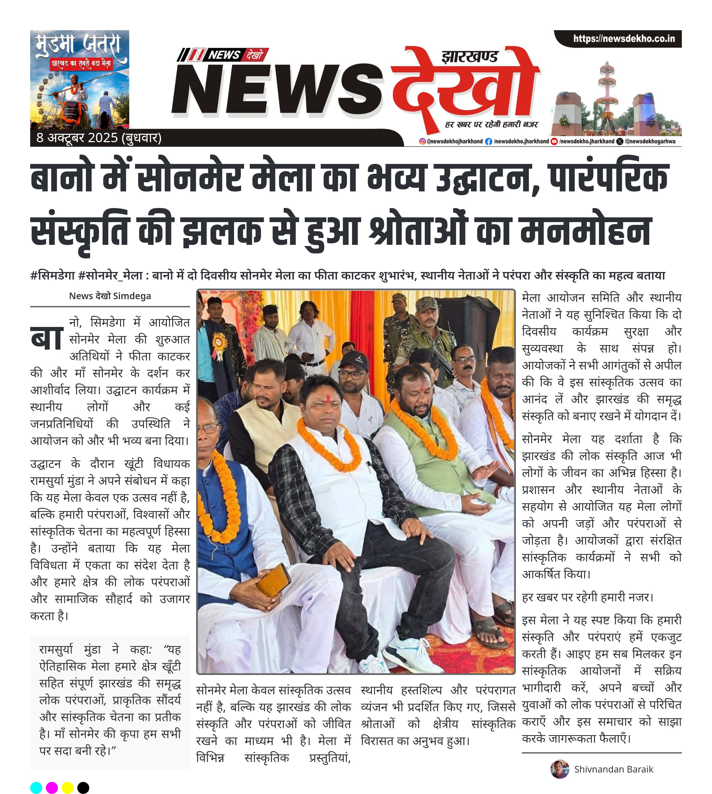 #सिमडेगा #सोनमेर_मेला : बानो में दो दिवसीय सोनमेर मेला का फीता काटकर शुभारंभ, स्थानीय नेताओं ने परंपरा और संस्कृति का महत्व बताया बानो, सिमडेगा में सोनमेर मेला का उद्घाटन दो दिवसीय आयोजन के रूप में हुआ। मेले के उद्घाटन में अतिथि सुदीप गुड़िया और खूंटी विधायक रामसुर्या मुंडा ने हिस्सा लिया। उद्घाटन के दौरान उन्होंने फीता काटकर मेला शुरू किया और माँ सोनमेर के दर्शन कर आशीर्वाद प्राप्त किया। तोरपा विधायक रामसुर्या मुंडा ने कहा कि मेला हमारी परंपराओं, विश्वासों…