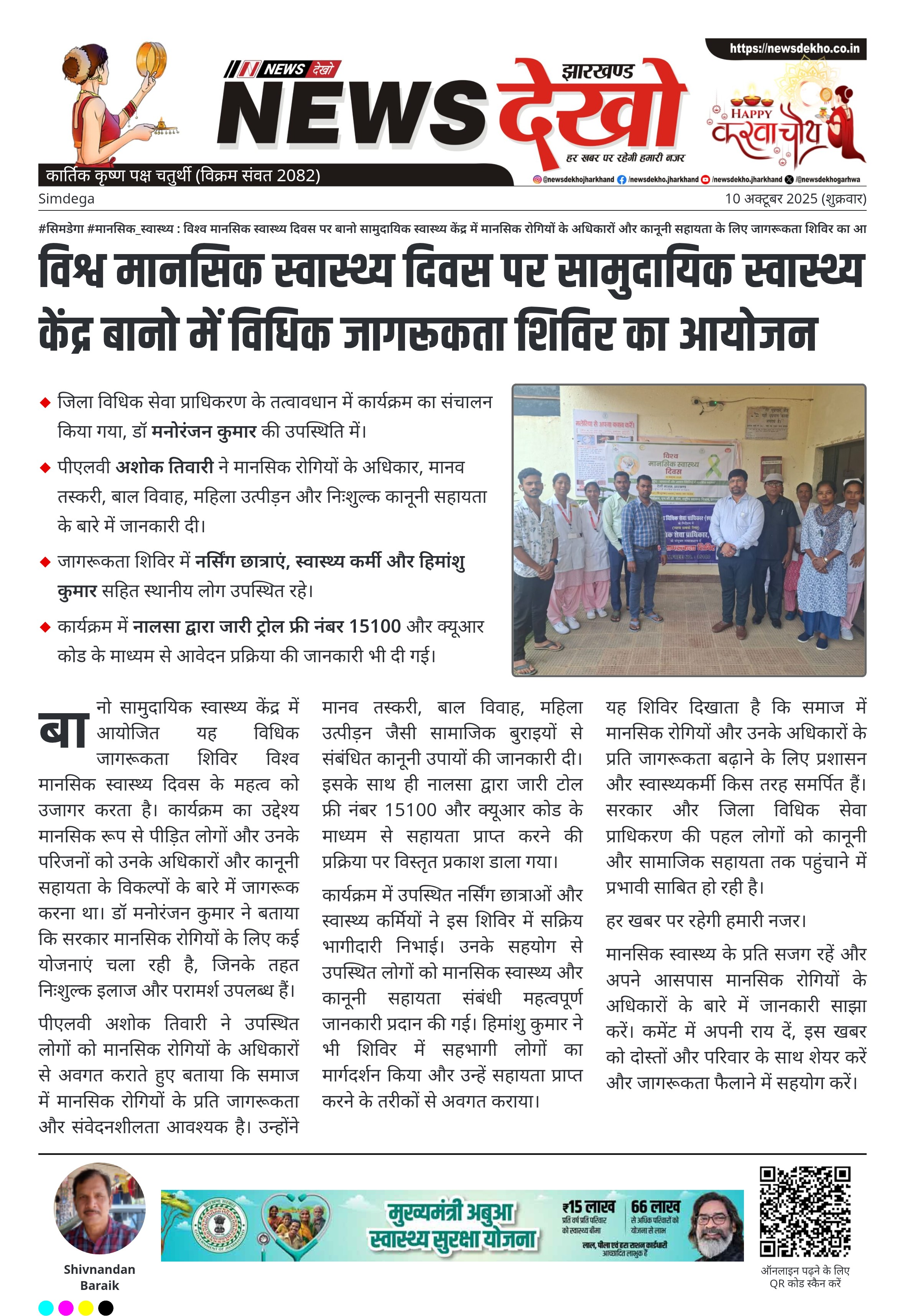 #सिमडेगा #मानसिक_स्वास्थ्य : विश्व मानसिक स्वास्थ्य दिवस पर बानो सामुदायिक स्वास्थ्य केंद्र में मानसिक रोगियों के अधिकारों और कानूनी सहायता के लिए जागरूकता शिविर का आयोजन सामुदायिक स्वास्थ्य केंद्र बानो में विश्व मानसिक स्वास्थ्य दिवस के अवसर पर विधिक जागरूकता शिविर आयोजित। जिला विधिक सेवा प्राधिकरण के तत्वावधान में कार्यक्रम का संचालन किया गया, डॉ मनोरंजन कुमार की उपस्थिति में। पीएलवी अशोक तिवारी ने मानसिक रोगियों के अधिकार, मानव तस्करी, बाल विवाह, महिला उत्पीड़न और निःशुल्क कानूनी सहायता के बारे…