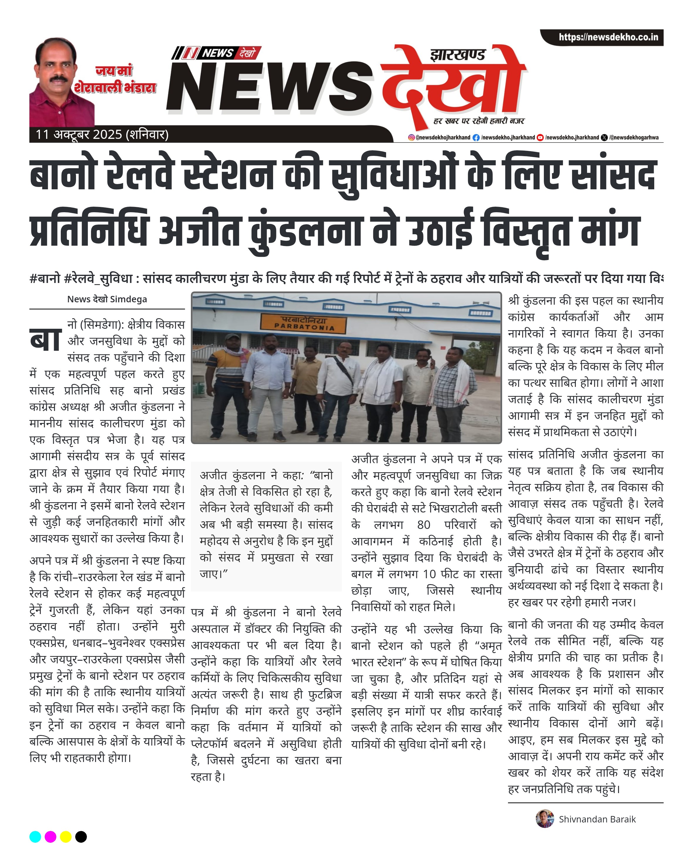 #बानो #रेलवे_सुविधा : सांसद कालीचरण मुंडा के लिए तैयार की गई रिपोर्ट में ट्रेनों के ठहराव और यात्रियों की जरूरतों पर दिया गया विशेष जोर सांसद प्रतिनिधि अजीत कुंडलना ने भेजा विस्तृत पत्र। मुरी एक्सप्रेस, धनबाद–भुवनेश्वर और जयपुर–राउरकेला एक्सप्रेस के बानो स्टेशन पर ठहराव की मांग। रेलवे अस्पताल में डॉक्टर की नियुक्ति और फुटब्रिज निर्माण को बताया आवश्यक। भिखराटोली बस्ती के 80 परिवारों के लिए 10 फीट रास्ते की मांग उठाई। अमृत भारत स्टेशन घोषित बानो में यात्रियों की सुविधा…