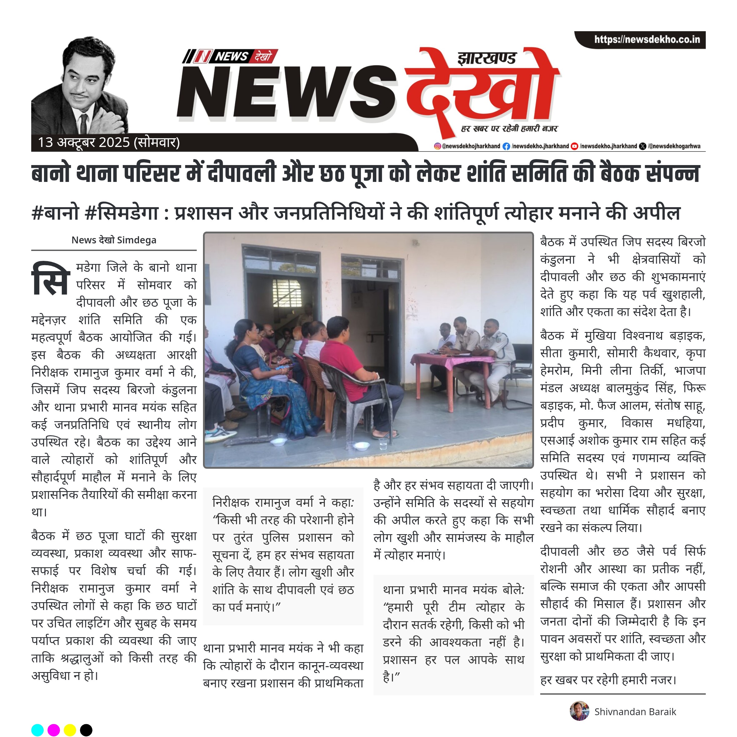 #बानो #सिमडेगा : प्रशासन और जनप्रतिनिधियों ने की शांतिपूर्ण त्योहार मनाने की अपील बानो थाना परिसर में दीपावली और छठ पूजा को लेकर शांति समिति की बैठक हुई। बैठक में आरक्षी निरीक्षक रामानुज कुमार वर्मा, जिप सदस्य बिरजो कंडुलना और थाना प्रभारी मानव मयंक शामिल रहे। छठ घाटों पर प्रकाश व्यवस्था और सुरक्षा उपायों पर चर्चा की गई। प्रशासन ने कहा — “किसी भी स्थिति में पुलिस प्रशासन मदद के लिए तैयार है।” जनप्रतिनिधियों ने लोगों से शांति और सौहार्द…