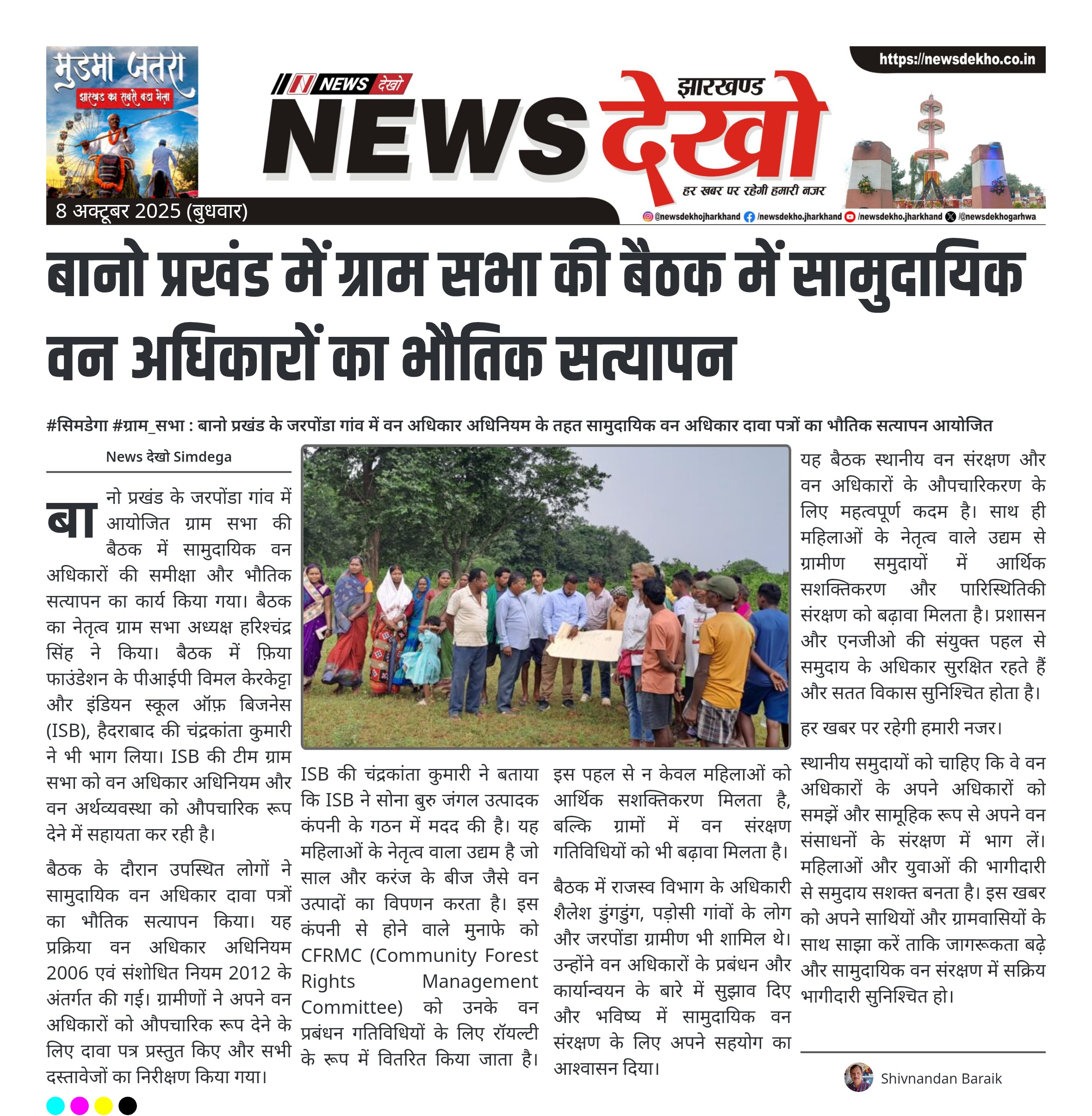 #सिमडेगा #ग्राम_सभा : बानो प्रखंड के जरपोंडा गांव में वन अधिकार अधिनियम के तहत सामुदायिक वन अधिकार दावा पत्रों का भौतिक सत्यापन आयोजित ग्राम सभा अध्यक्ष हरिश्चंद्र सिंह की अध्यक्षता में बैठक का आयोजन किया गया। बैठक में वन अधिकार अधिनियम 2006 और संशोधित नियम 2012 के तहत सामुदायिक वन अधिकार दावा पत्रों का सत्यापन किया गया। फिया फाउंडेशन के पीआईपी विमल केरकेट्टा और ISB हैदराबाद के फील्ड असिस्टेंट चंद्रकांता कुमारी उपस्थित रही। ISB ने सोना बुरु जंगल उत्पादक कंपनी…