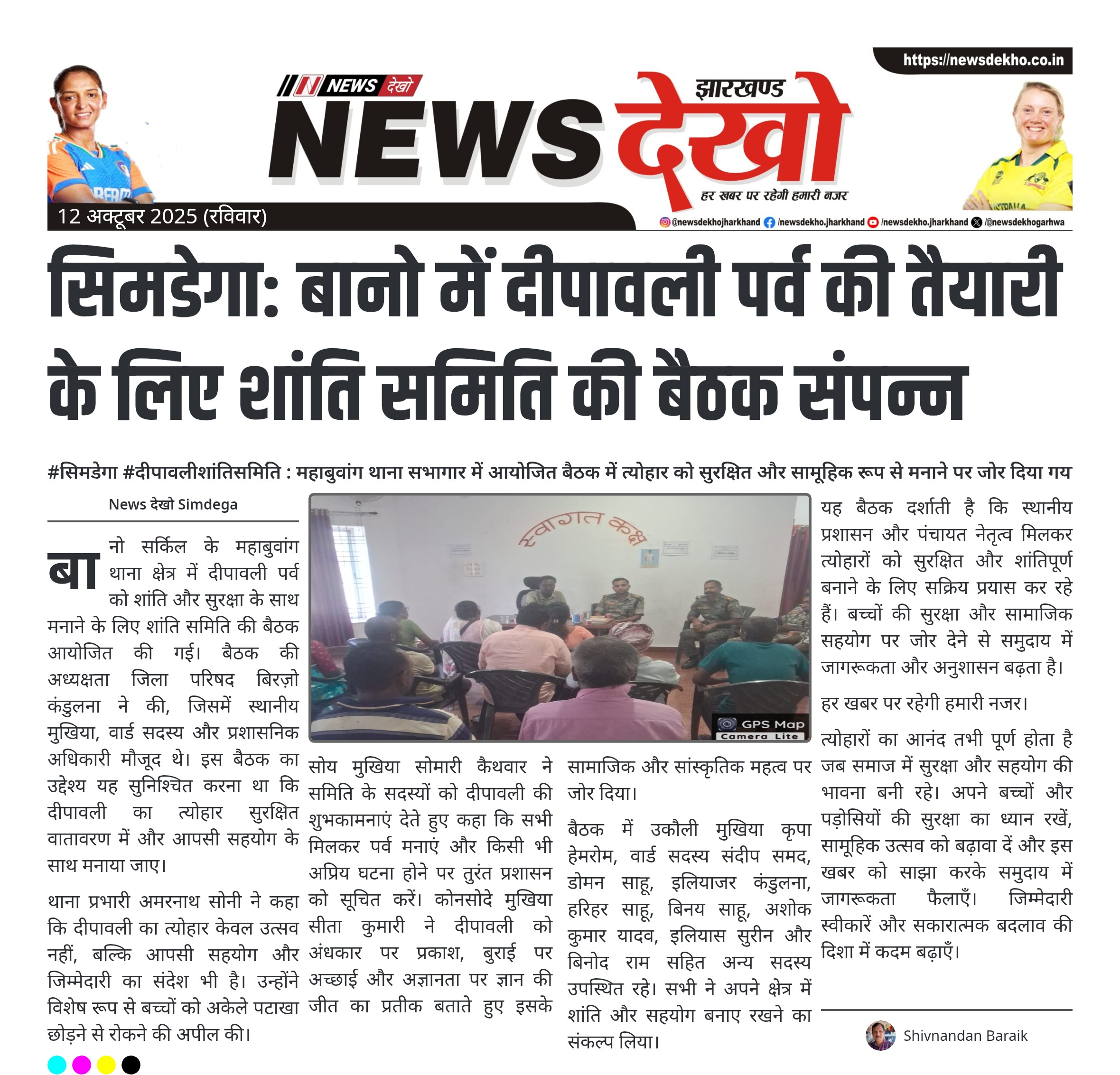 #सिमडेगा #दीपावलीशांतिसमिति : महाबुवांग थाना सभागार में आयोजित बैठक में त्योहार को सुरक्षित और सामूहिक रूप से मनाने पर जोर दिया गया महाबुवांग थाना सभागार में जिला परिषद बिरज़ो कंडुलना की अध्यक्षता में दीपावली शांति समिति की बैठक हुई। थाना प्रभारी अमरनाथ सोनी ने बच्चों को अकेले पटाखा छोड़ने से रोकने और आपसी सहयोग से त्योहार मनाने का निर्देश दिया। सोय मुखिया सोमारी कैथवार ने सभी सदस्यों को दीपावली की शुभकामनाएं दी और मिलजुल कर पर्व मनाने का संदेश दिया।…