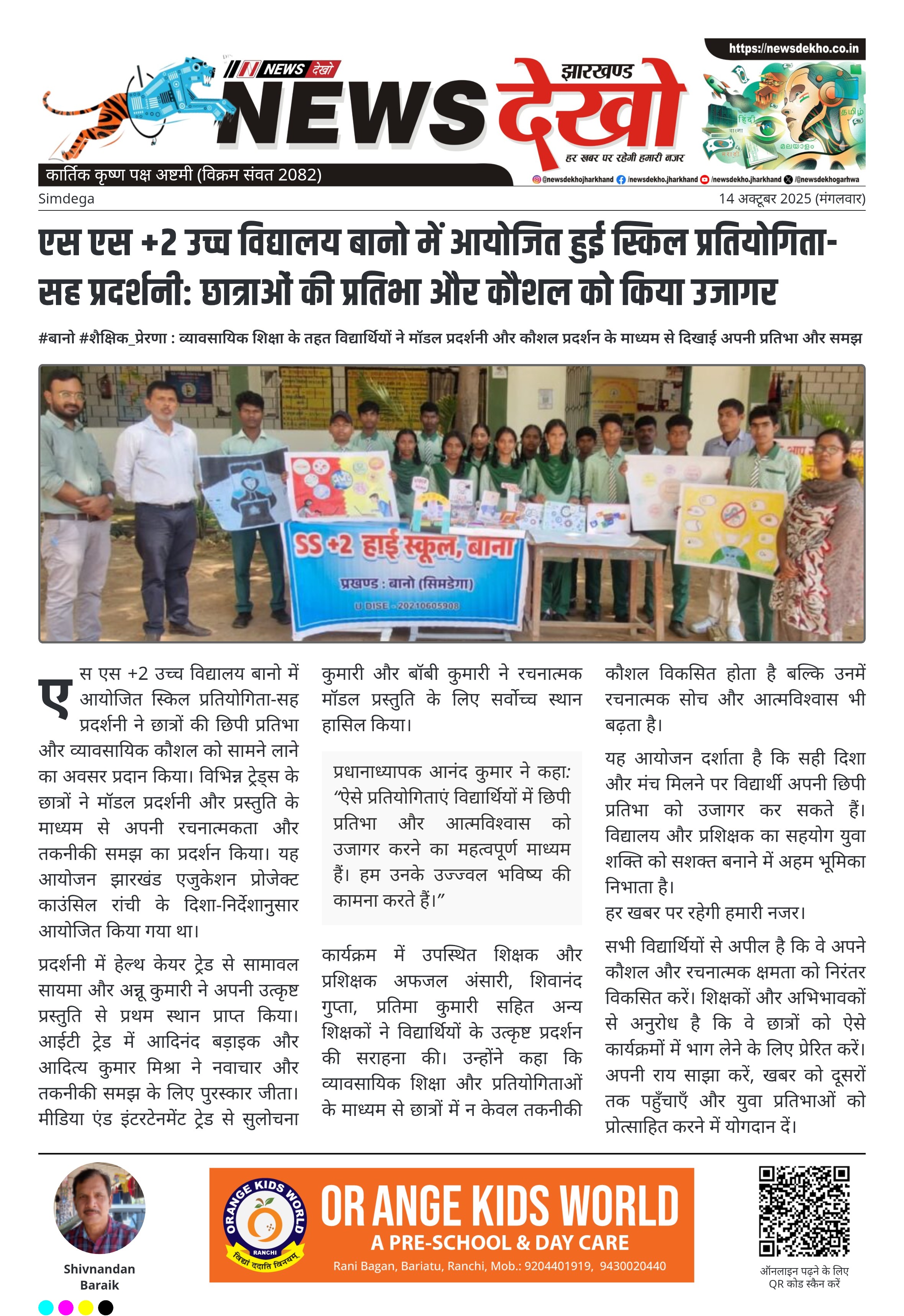 #बानो #शैक्षिक_प्रेरणा : व्यावसायिक शिक्षा के तहत विद्यार्थियों ने मॉडल प्रदर्शनी और कौशल प्रदर्शन के माध्यम से दिखाई अपनी प्रतिभा और समझ एस एस +2 उच्च विद्यालय बानो में व्यावसायिक शिक्षा के तहत स्किल प्रतियोगिता-सह प्रदर्शनी का आयोजन। विद्यार्थियों ने हेल्थ केयर, आईटी और मीडिया एंड इंटरटेनमेंट ट्रेड में अपने कौशल का प्रदर्शन किया। सामावल सायमा और अन्नू कुमारी, आदिनंद बड़ाइक और आदित्य कुमार मिश्रा, सुलोचना कुमारी और बॉबी कुमारी ने क्रमशः प्रथम स्थान प्राप्त किया। प्रधानाध्यापक आनंद कुमार, शिक्षकगण…