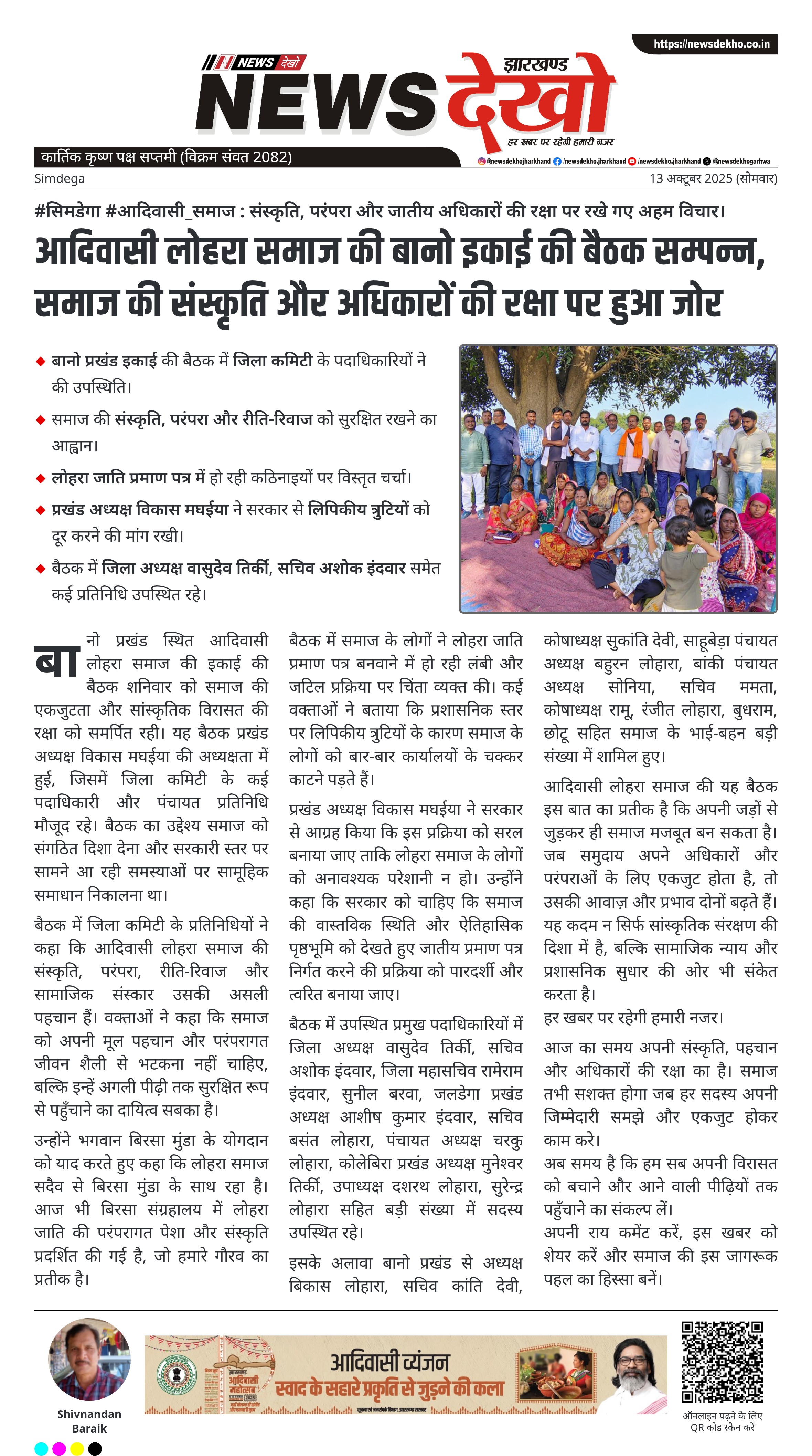 #सिमडेगा #आदिवासी_समाज : संस्कृति, परंपरा और जातीय अधिकारों की रक्षा पर रखे गए अहम विचार। बानो प्रखंड इकाई की बैठक में जिला कमिटी के पदाधिकारियों ने की उपस्थिति। समाज की संस्कृति, परंपरा और रीति-रिवाज को सुरक्षित रखने का आह्वान। लोहरा जाति प्रमाण पत्र में हो रही कठिनाइयों पर विस्तृत चर्चा। प्रखंड अध्यक्ष विकास मघईया ने सरकार से लिपिकीय त्रुटियों को दूर करने की मांग रखी। बैठक में जिला अध्यक्ष वासुदेव तिर्की, सचिव अशोक इंदवार समेत कई प्रतिनिधि उपस्थित रहे। बानो…