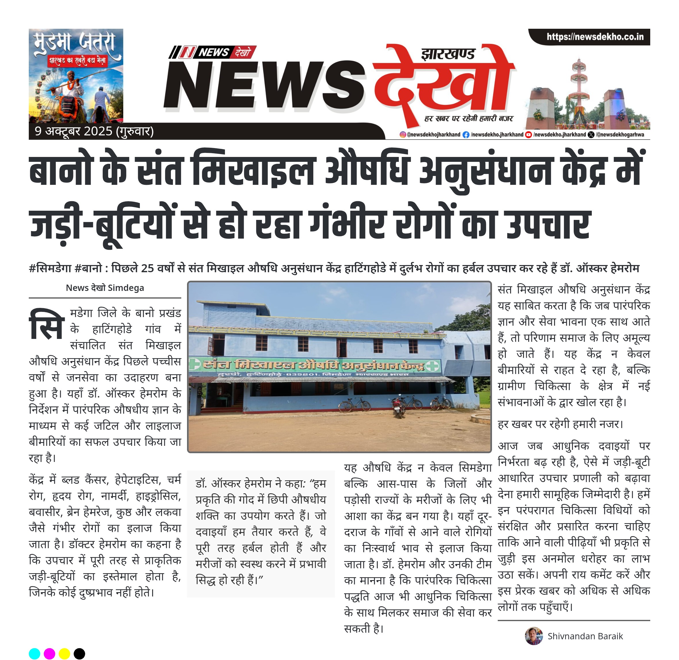 #सिमडेगा #बानो : पिछले 25 वर्षों से संत मिखाइल औषधि अनुसंधान केंद्र हाटिंगहोडे में दुर्लभ रोगों का हर्बल उपचार कर रहे हैं डॉ. ऑस्कर हेमरोम बानो प्रखंड के हाटिंगहोडे स्थित केंद्र पिछले 25 वर्षों से सेवा में सक्रिय। ब्लड कैंसर, हेपेटाइटिस, हृदय रोग, कुष्ठ, लकवा जैसे गंभीर रोगों का इलाज। सभी उपचार जड़ी-बूटी आधारित औषधियों से किए जाते हैं। डॉ. ऑस्कर हेमरोम ने बताया कि इलाज पूरी तरह प्राकृतिक और पारंपरिक विधि पर आधारित है। केंद्र में दूर-दराज के मरीजों…