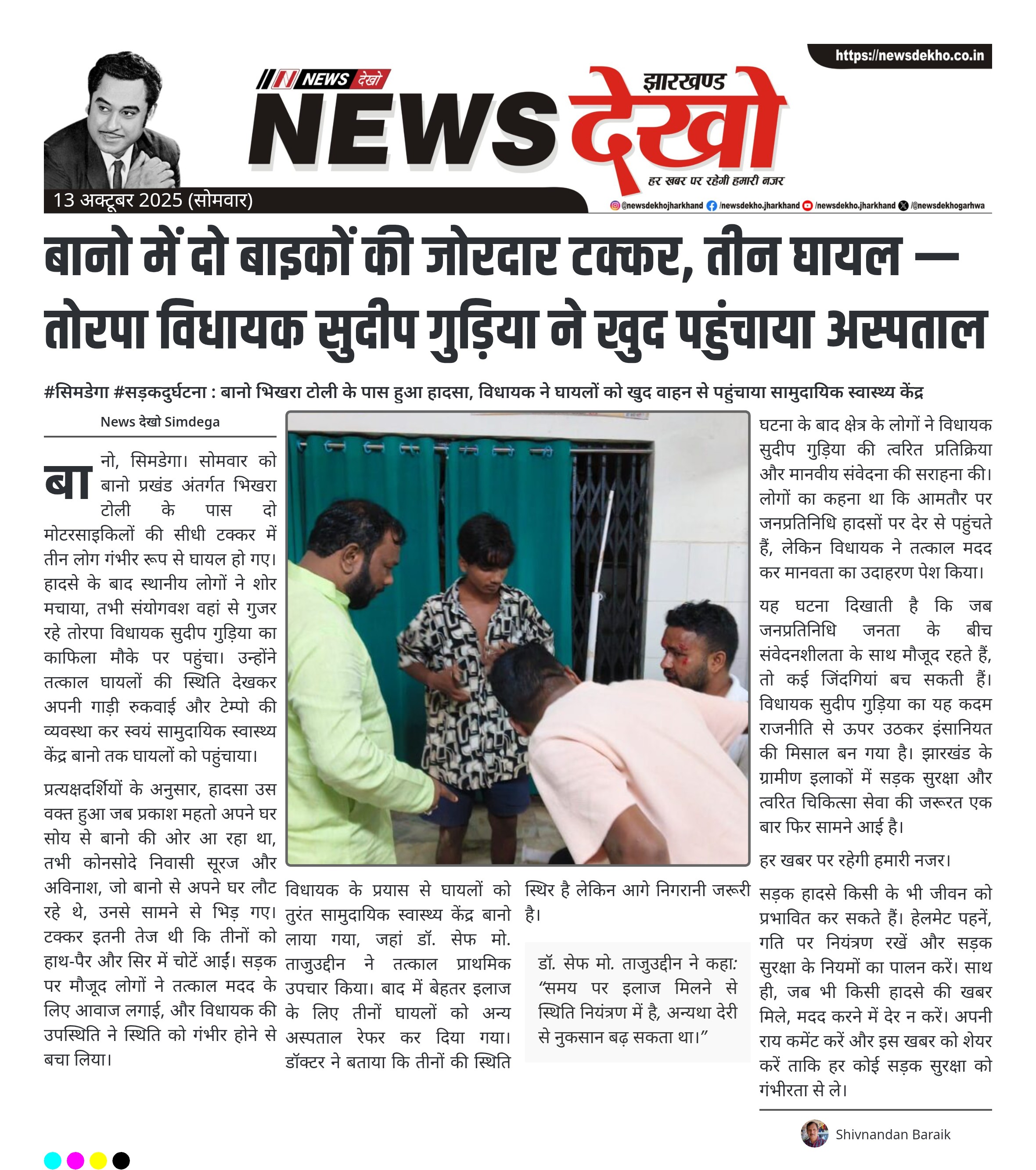 #सिमडेगा #सड़कदुर्घटना : बानो भिखरा टोली के पास हुआ हादसा, विधायक ने घायलों को खुद वाहन से पहुंचाया सामुदायिक स्वास्थ्य केंद्र बानो भिखरा टोली के पास दो बाइकों की टक्कर में तीन युवक घायल। तोरपा विधायक सुदीप गुड़िया मौके पर पहुंचे और घायलों को अस्पताल भेजा। डॉ. सेफ मो. ताजुउद्दीन ने प्राथमिक उपचार कर बेहतर इलाज के लिए रेफर किया। प्रकाश महतो, सूरज और अविनाश हादसे में हुए घायल। विधायक के त्वरित सहयोग से समय पर इलाज शुरू किया जा…