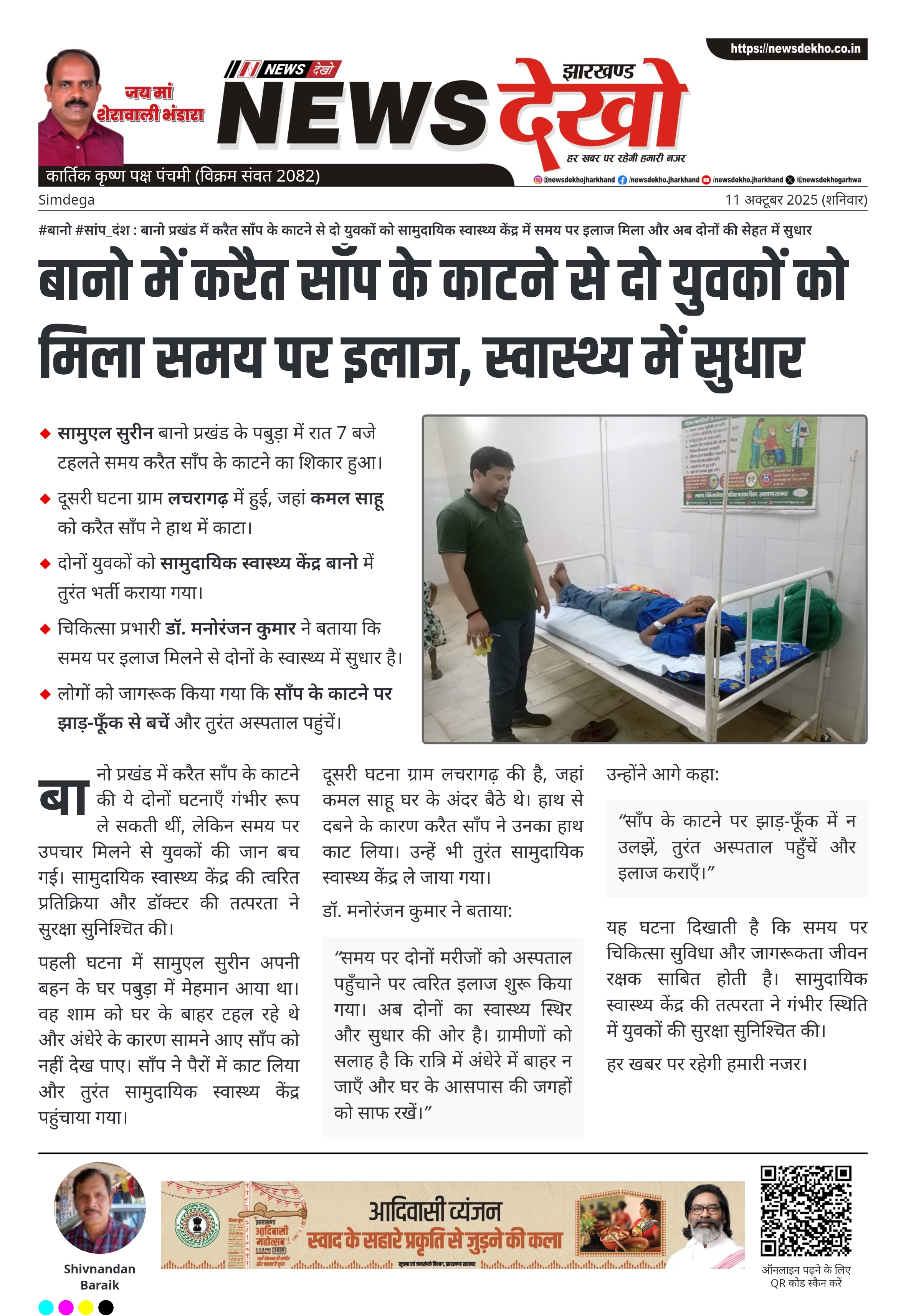 #बानो #सांप_दंश : बानो प्रखंड में करैत साँप के काटने से दो युवकों को सामुदायिक स्वास्थ्य केंद्र में समय पर इलाज मिला और अब दोनों की सेहत में सुधार सामुएल सुरीन बानो प्रखंड के पबुड़ा में रात 7 बजे टहलते समय करैत साँप के काटने का शिकार हुआ। दूसरी घटना ग्राम लचरागढ़ में हुई, जहां कमल साहू को करैत साँप ने हाथ में काटा। दोनों युवकों को सामुदायिक स्वास्थ्य केंद्र बानो में तुरंत भर्ती कराया गया। चिकित्सा प्रभारी डॉ. मनोरंजन…