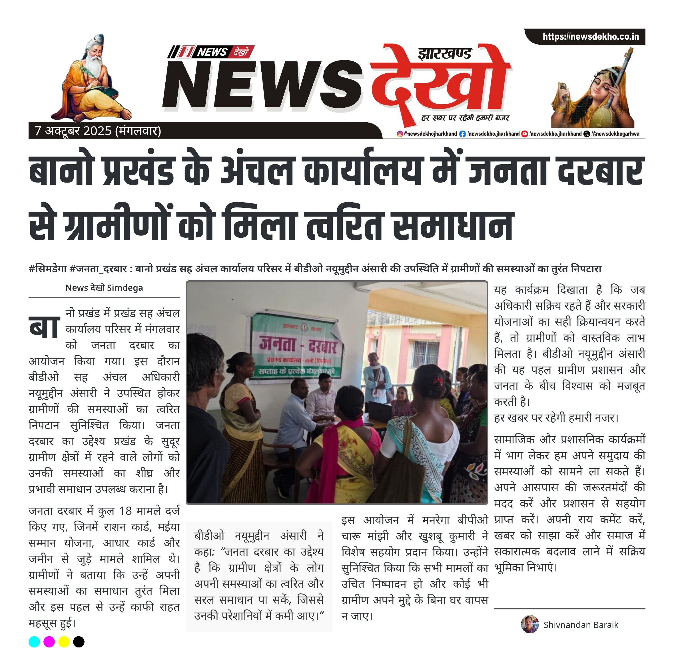 #सिमडेगा #जनता_दरबार : बानो प्रखंड सह अंचल कार्यालय परिसर में बीडीओ नयूमुद्दीन अंसारी की उपस्थिति में ग्रामीणों की समस्याओं का तुरंत निपटारा प्रखंड सह अंचल कार्यालय परिसर में जनता दरबार का आयोजन। बीडीओ सह अंचल अधिकारी नयूमुद्दीन अंसारी की उपस्थिति में ग्रामीणों की समस्याओं का समाधान। 18 मामले Rashan Card, मईया सम्मान योजना, आधार कार्ड और जमीन से संबंधित। ग्रामीण क्षेत्रों से आए लोगों को त्वरित निष्पादन का लाभ मिला। आयोजन में मनरेगा बीपीओ चारू मांझी और खुशबू कुमारी ने…