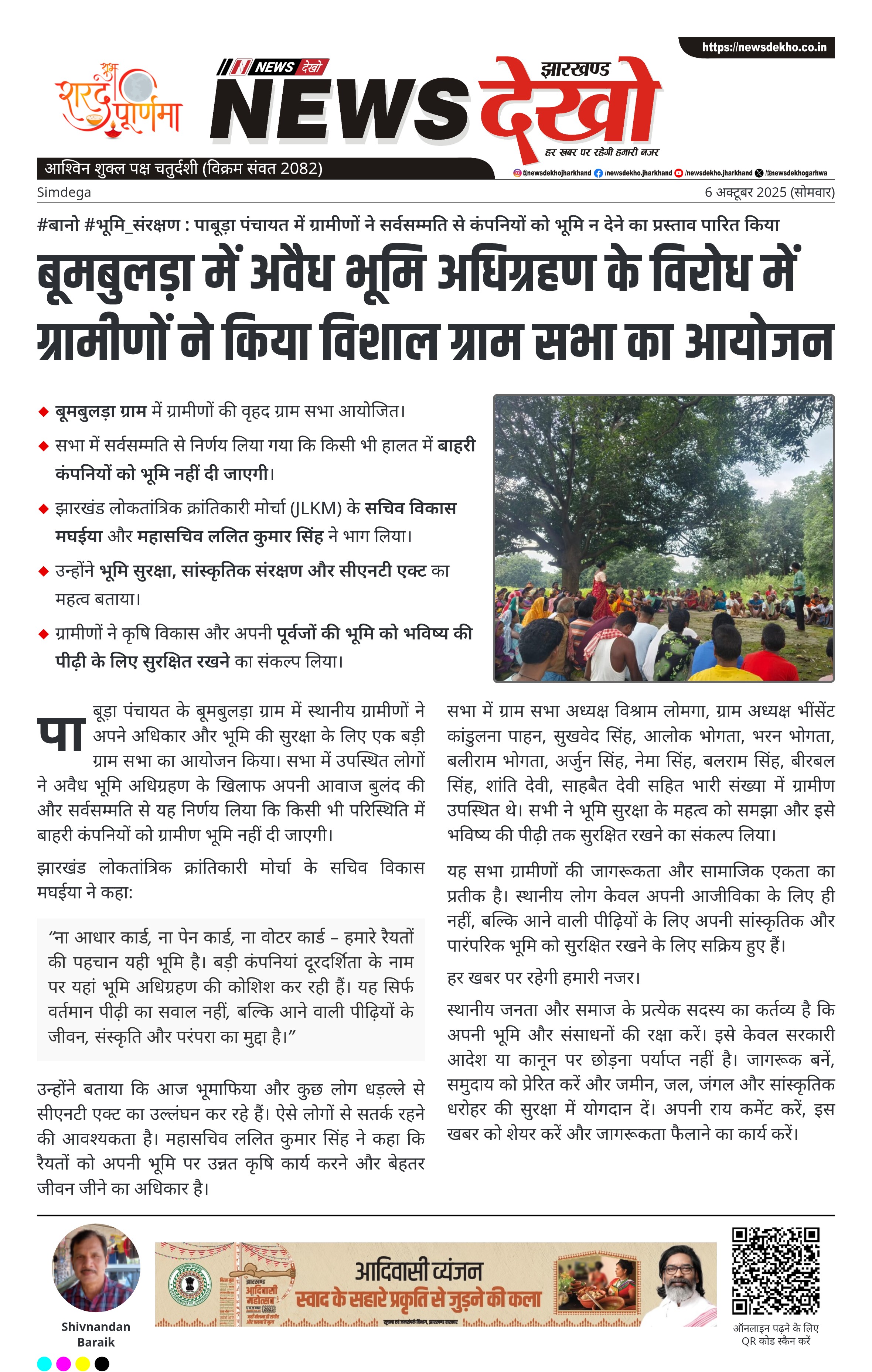 #बानो #भूमि_संरक्षण : पाबूड़ा पंचायत में ग्रामीणों ने सर्वसम्मति से कंपनियों को भूमि न देने का प्रस्ताव पारित किया बूमबुलड़ा ग्राम में ग्रामीणों की वृहद ग्राम सभा आयोजित। सभा में सर्वसम्मति से निर्णय लिया गया कि किसी भी हालत में बाहरी कंपनियों को भूमि नहीं दी जाएगी। झारखंड लोकतांत्रिक क्रांतिकारी मोर्चा (JLKM) के सचिव विकास मघईया और महासचिव ललित कुमार सिंह ने भाग लिया। उन्होंने भूमि सुरक्षा, सांस्कृतिक संरक्षण और सीएनटी एक्ट का महत्व बताया। ग्रामीणों ने कृषि विकास और…