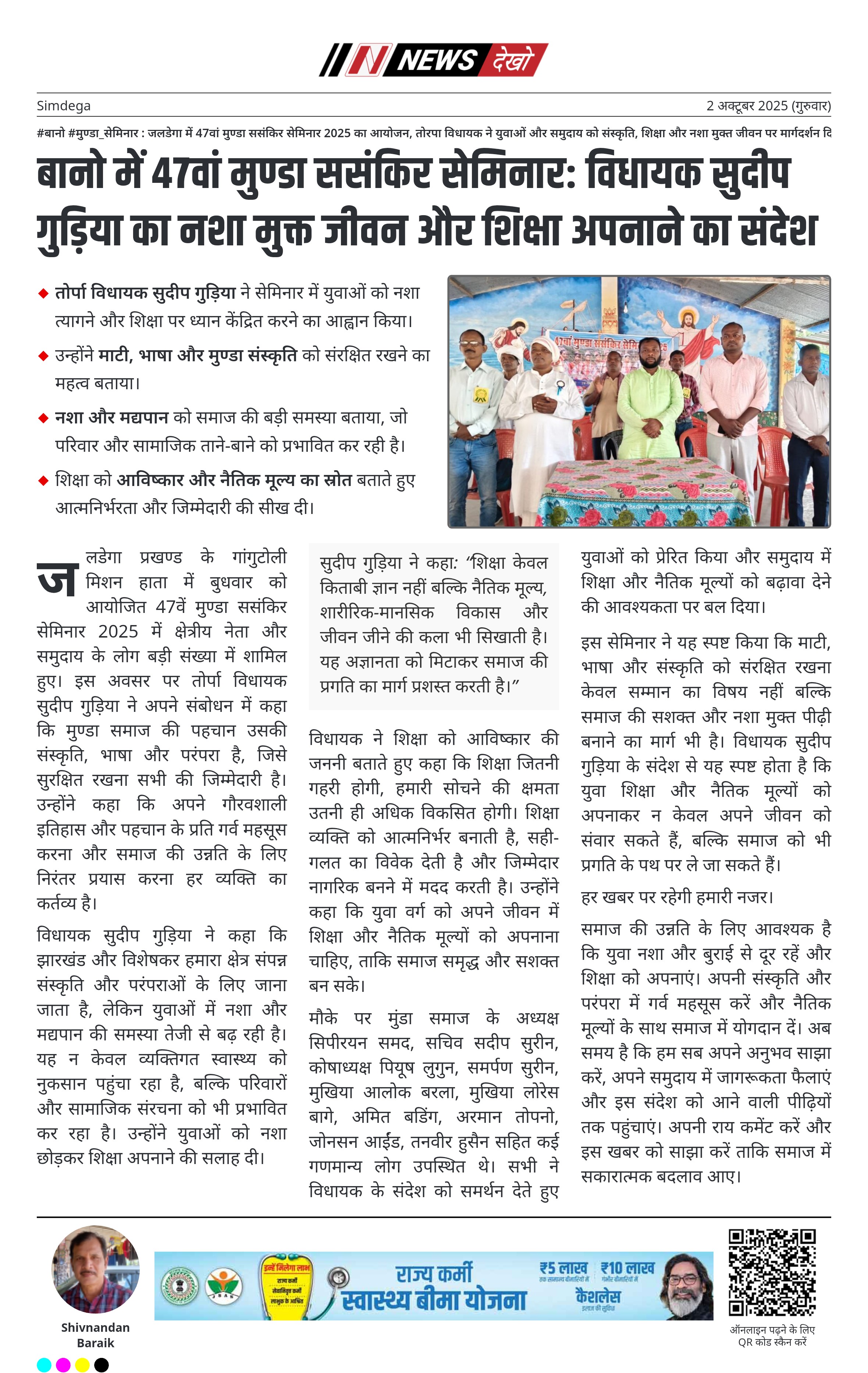 बानो में 47वां मुण्डा ससंकिर सेमिनार: विधायक सुदीप गुड़िया का नशा मुक्त जीवन और शिक्षा अपनाने का संदेश