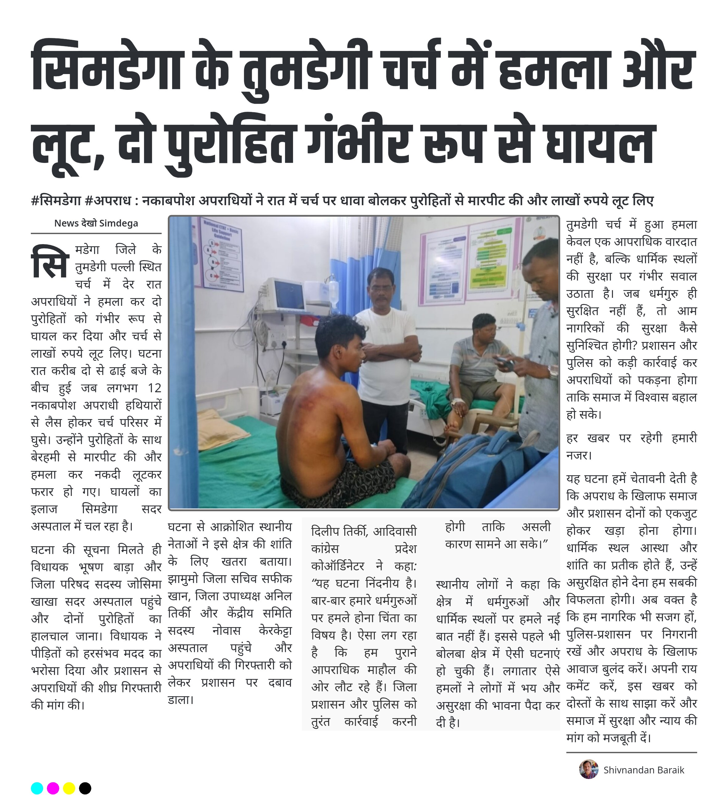 #सिमडेगा #अपराध : नकाबपोश अपराधियों ने रात में चर्च पर धावा बोलकर पुरोहितों से मारपीट की और लाखों रुपये लूट लिए तुमडेगी चर्च में देर रात लगभग 12 अपराधियों ने हमला किया। दो पुरोहित गंभीर रूप से घायल, सिमडेगा सदर अस्पताल में चल रहा इलाज। नकाबपोश अपराधी हथियारबंद थे और लाखों रुपये लेकर फरार हो गए। विधायक भूषण बाड़ा और जिप सदस्य जोसिमा खाखा ने अस्पताल पहुंचकर हाल जाना। झामुमो और कांग्रेस नेताओं ने तत्काल गिरफ्तारी की मांग की। सिमडेगा…