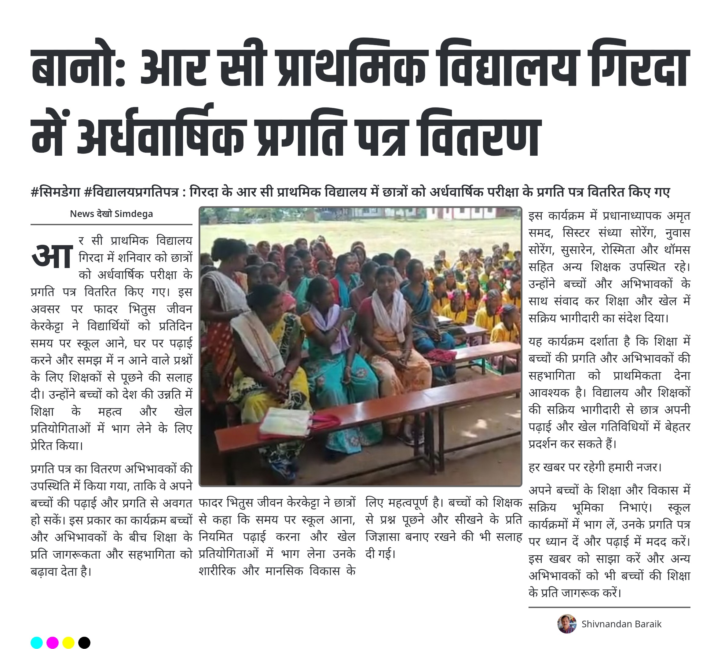 #सिमडेगा #विद्यालयप्रगतिपत्र : गिरदा के आर सी प्राथमिक विद्यालय में छात्रों को अर्धवार्षिक परीक्षा के प्रगति पत्र वितरित किए गए शनिवार को आर सी प्राथमिक विद्यालय गिरदा में अर्धवार्षिक प्रगति पत्र का वितरण हुआ। फादर भितुस जीवन केरकेट्टा ने बच्चों को समय पर स्कूल आने और रोज पढ़ाई करने की सलाह दी। छात्रों को खेल प्रतियोगिताओं में भाग लेने और शिक्षकों से संदेह पूछने की प्रेरणा दी गई। प्रगति पत्र अभिभावकों की उपस्थिति में वितरित किए गए। मौके पर प्रधानाध्यापक…