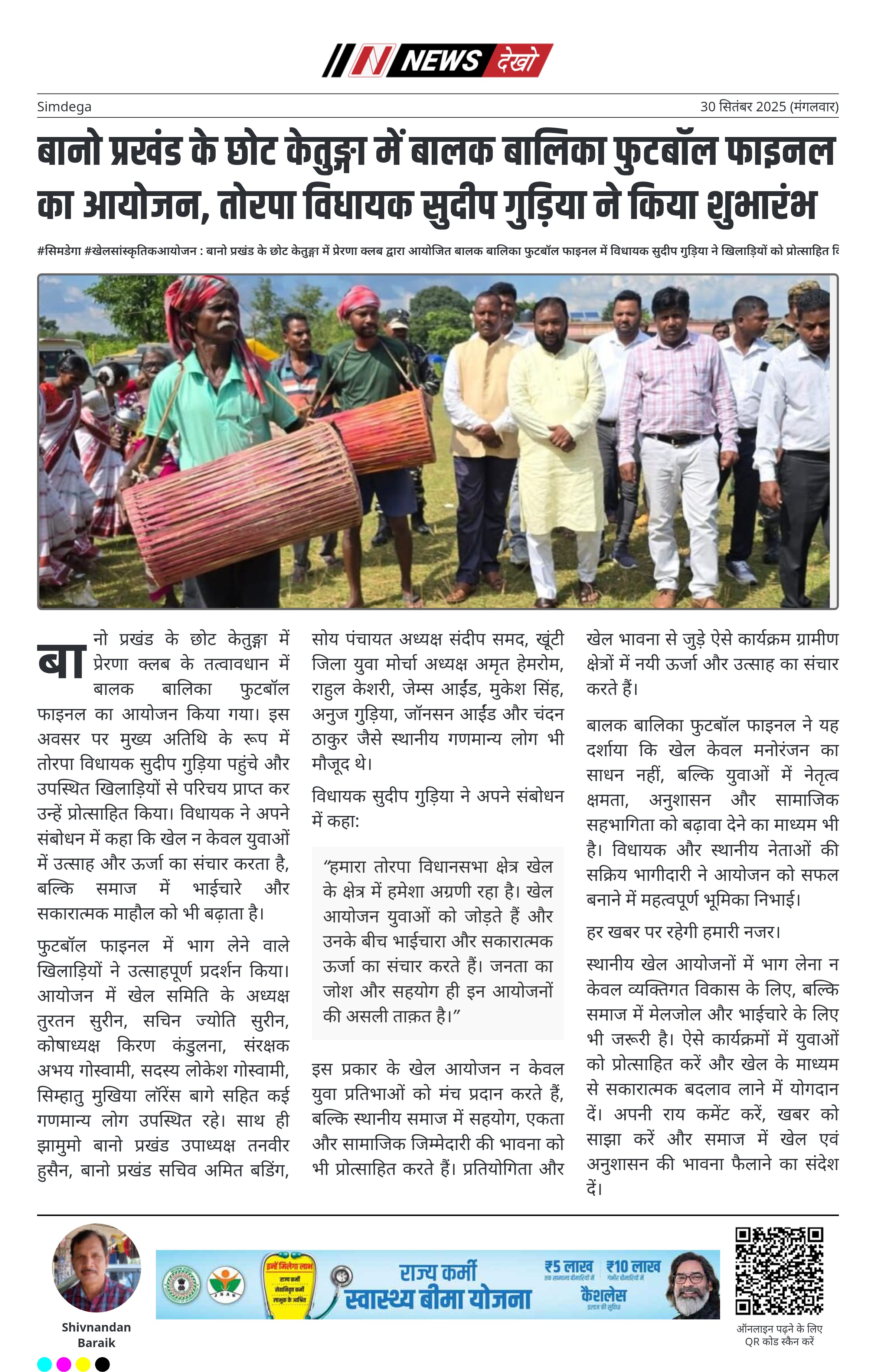#सिमडेगा #खेलसांस्कृतिकआयोजन : बानो प्रखंड के छोट केतुङ्गा में प्रेरणा क्लब द्वारा आयोजित बालक बालिका फुटबॉल फाइनल में विधायक सुदीप गुड़िया ने खिलाड़ियों को प्रोत्साहित किया बानो प्रखंड कोनसौदे पंचायत के छोट केतुङ्गा में बालक बालिका फुटबॉल फाइनल का आयोजन हुआ। मुख्य अतिथि के रूप में तोरपा विधायक सुदीप गुड़िया उपस्थित रहे और खिलाड़ियों से परिचय लेकर उनका उत्साहवर्धन किया। विधायक ने कहा कि तोरपा विधानसभा क्षेत्र में खेल का विशेष महत्व है और ऐसे आयोजन युवा ऊर्जा और भाईचारे…