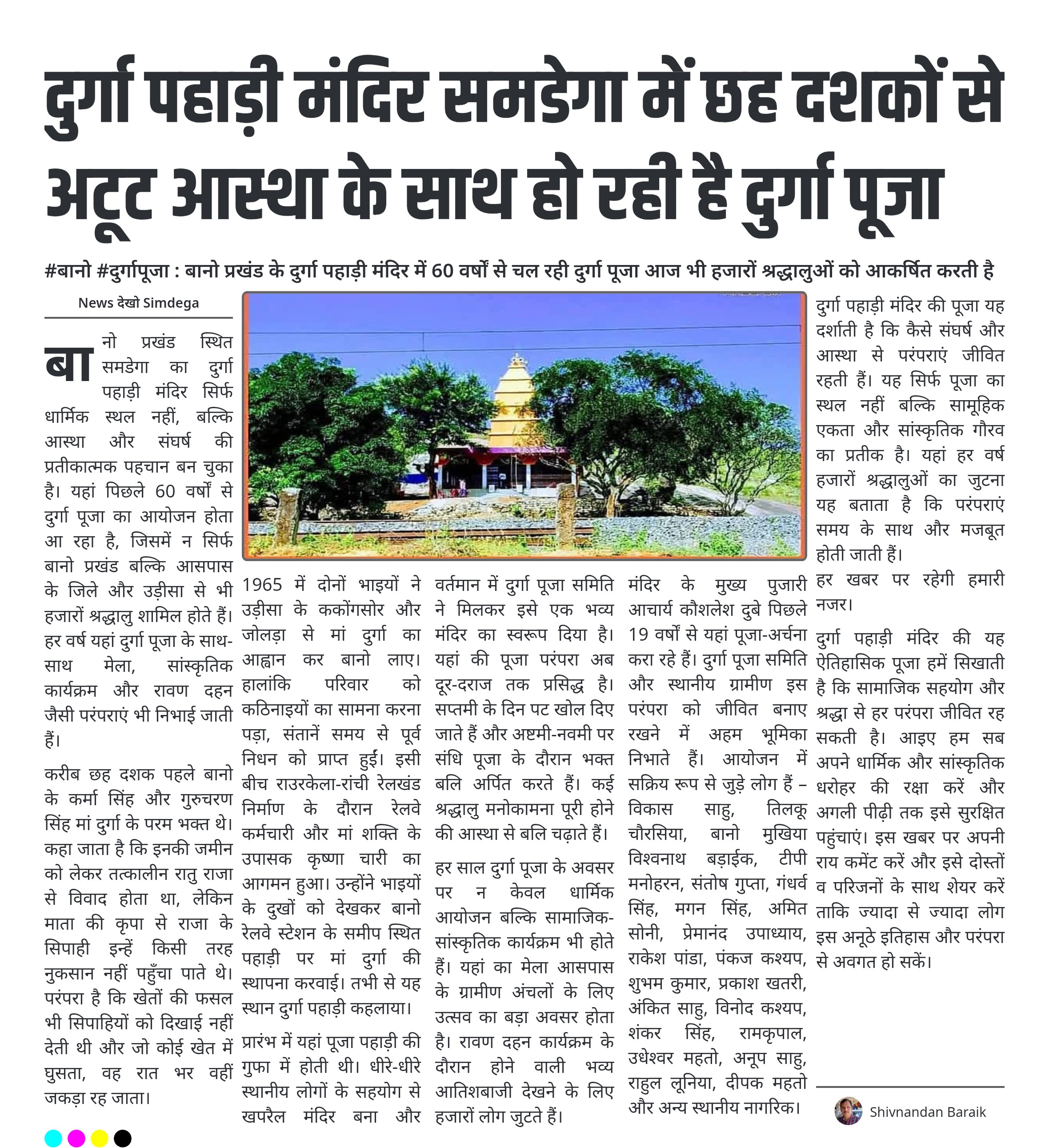 दुर्गा पहाड़ी मंदिर समडेगा में छह दशकों से अटूट आस्था के साथ हो रही है दुर्गा पूजा