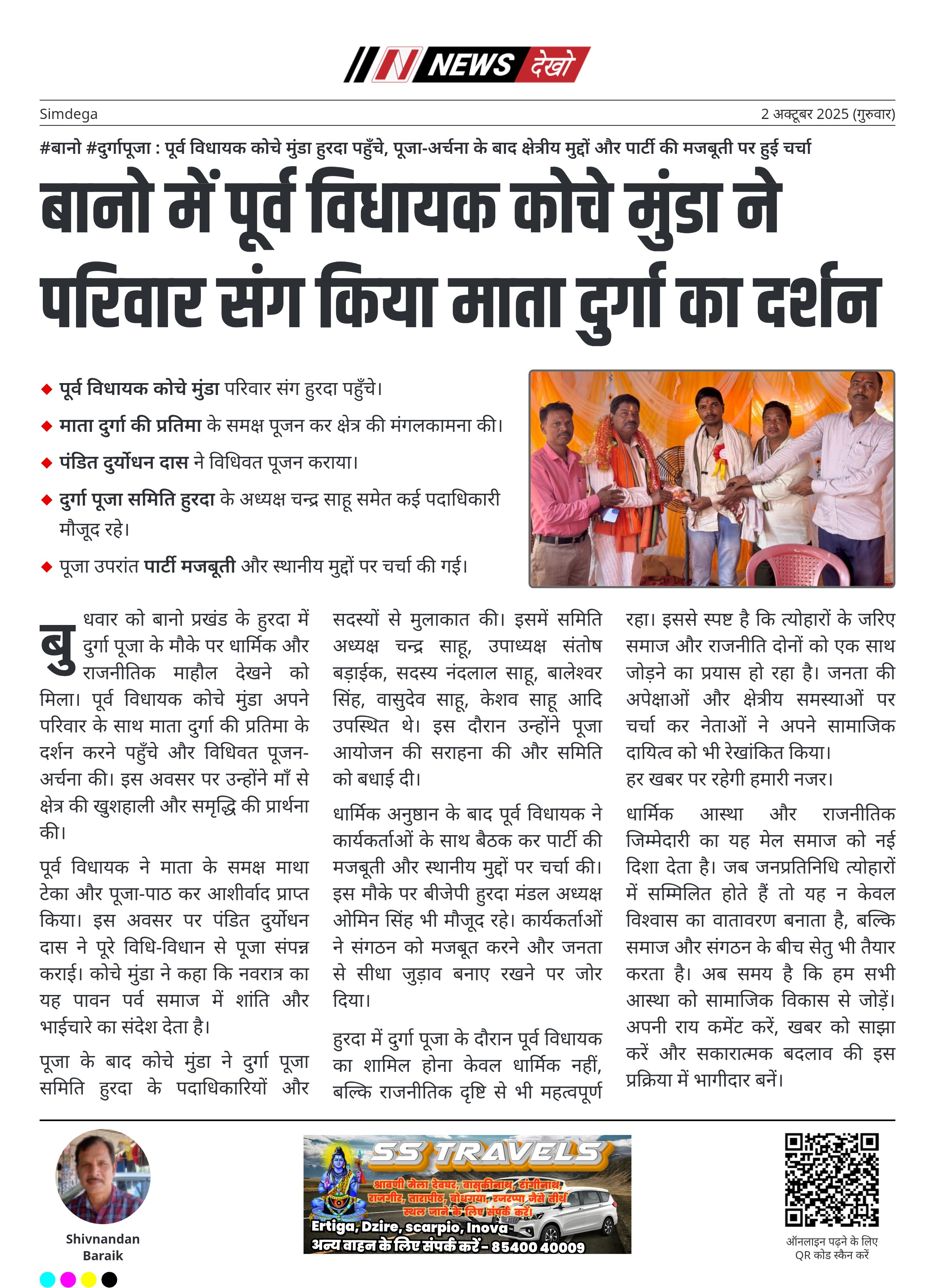 #बानो #दुर्गापूजा : पूर्व विधायक कोचे मुंडा हुरदा पहुँचे, पूजा-अर्चना के बाद क्षेत्रीय मुद्दों और पार्टी की मजबूती पर हुई चर्चा पूर्व विधायक कोचे मुंडा परिवार संग हुरदा पहुँचे। माता दुर्गा की प्रतिमा के समक्ष पूजन कर क्षेत्र की मंगलकामना की। पंडित दुर्योधन दास ने विधिवत पूजन कराया। दुर्गा पूजा समिति हुरदा के अध्यक्ष चन्द्र साहू समेत कई पदाधिकारी मौजूद रहे। पूजा उपरांत पार्टी मजबूती और स्थानीय मुद्दों पर चर्चा की गई। बुधवार को बानो प्रखंड के हुरदा में दुर्गा…