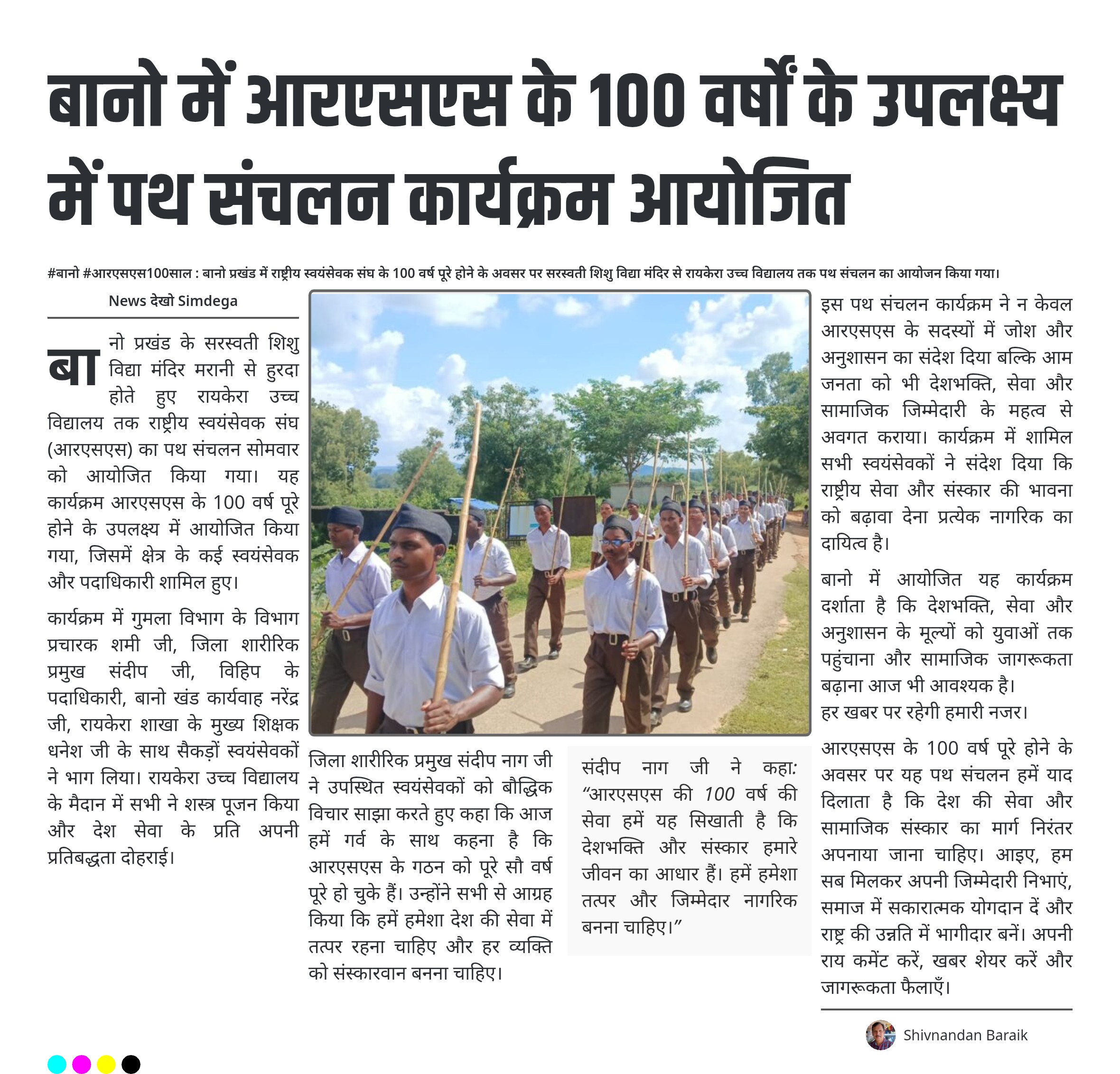 #बानो #आरएसएस100साल : बानो प्रखंड में राष्ट्रीय स्वयंसेवक संघ के 100 वर्ष पूरे होने के अवसर पर सरस्वती शिशु विद्या मंदिर से रायकेरा उच्च विद्यालय तक पथ संचलन का आयोजन किया गया। पथ संचलन कार्यक्रम सरस्वती शिशु विद्या मंदिर, मरानी से रायकेरा उच्च विद्यालय तक। कार्यक्रम आरएसएस के 100 वर्ष पूर्ण होने के उपलक्ष्य में आयोजित। गुमला विभाग प्रचारक शमी जी, जिला शारीरिक प्रमुख संदीप जी सहित कई पदाधिकारी और स्वयंसेवक उपस्थित। उच्च विद्यालय रायकेरा में शस्त्र पूजन और बौद्धिक…