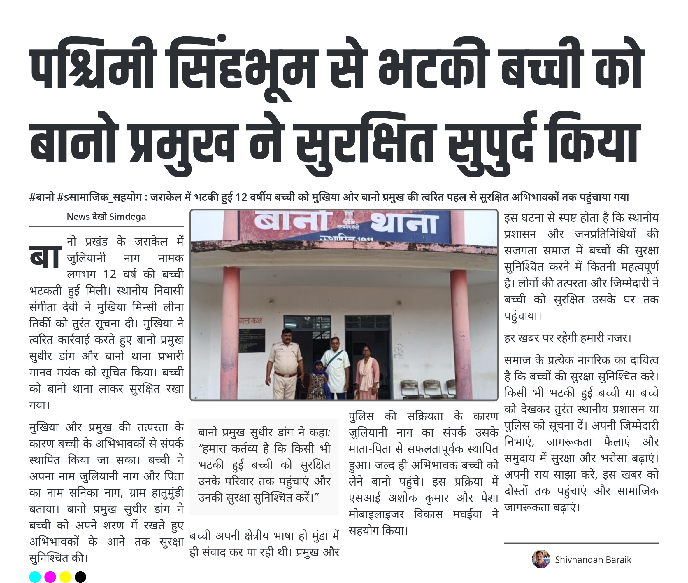 #बानो #sसामाजिक_सहयोग : जराकेल में भटकी हुई 12 वर्षीय बच्ची को मुखिया और बानो प्रमुख की त्वरित पहल से सुरक्षित अभिभावकों तक पहुंचाया गया लगभग 12 वर्ष की बच्ची जुलियानी नाग पश्चिमी सिंहभूम से भटककर बानो प्रखंड के जराकेल पहुंची। स्थानीय निवासी संगीता देवी ने मुखिया मिन्सी लीना तिर्की को जानकारी दी। मुखिया ने बानो प्रमुख सुधीर डांग और बानो थाना प्रभारी मानव मयंक को सूचित किया। बच्ची को मुखिया ने अपने शरण में रखा और अभिभावकों से संपर्क कर…