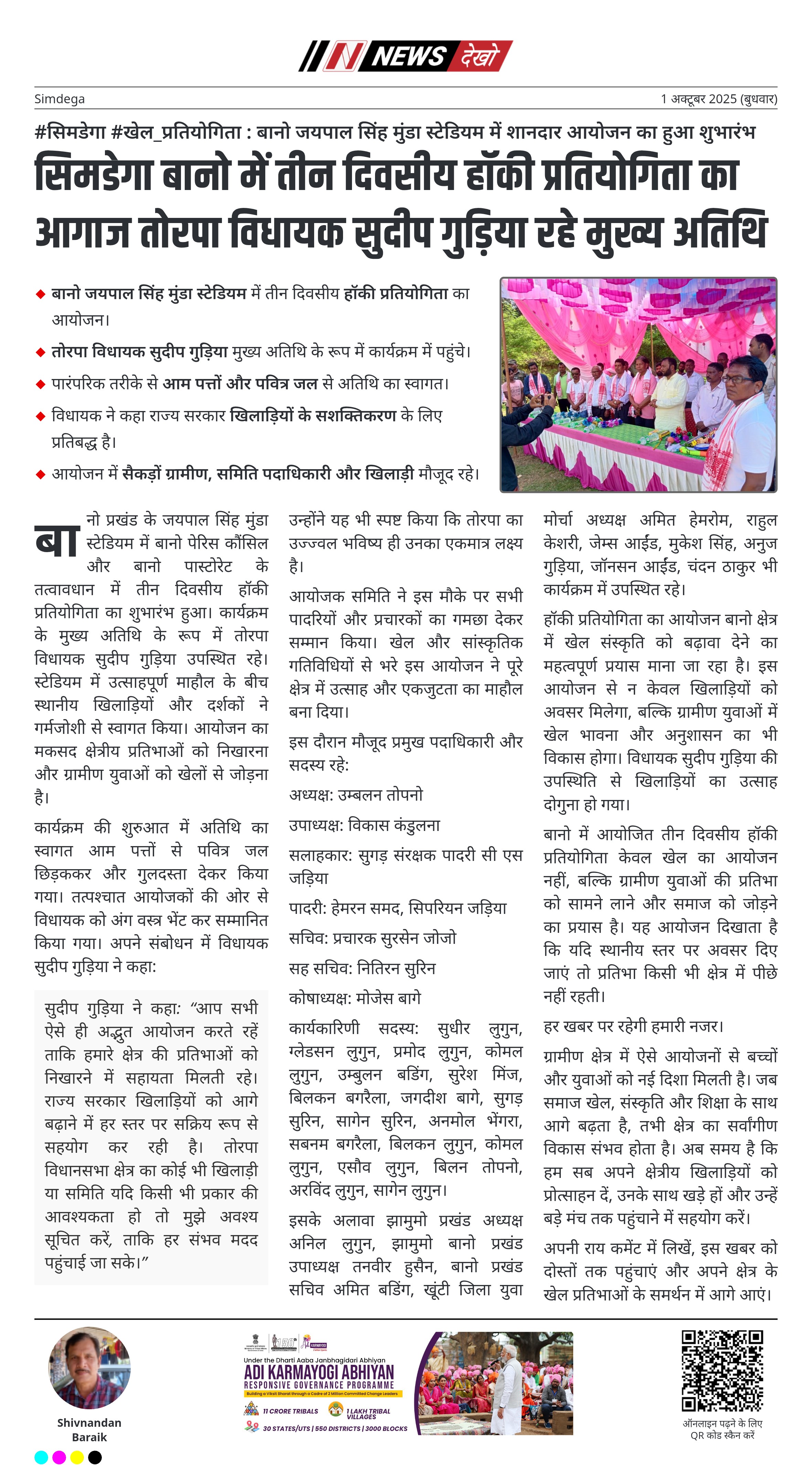 बानो #विधायकदौरा : खेल, संस्कृति और आस्था से जुड़ी गतिविधियों में आज दिखेगा जनप्रतिनिधि का जुड़ाव तोरपा विधायक सुदीप गुड़िया आज करेंगे बानो प्रखंड का दौरा सुबह 11 बजे केतुंगा ठरकीटांड मैदान में खेलकूद प्रतियोगिता का उद्घाटन करेंगे दोपहर 12 बजे श्री दुर्गा पहाड़ी मंदिर पहुँच कर लेंगे माता का आशीर्वाद जयपाल सिंह मुंडा खेल मैदान में 12:30 बजे होंगे हॉकी टूर्नामेंट में शामिल दोपहर 2 बजे हुरदा में मुंडा समिति द्वारा आयोजित हॉकी प्रतियोगिता के समापन समारोह में होंगे…