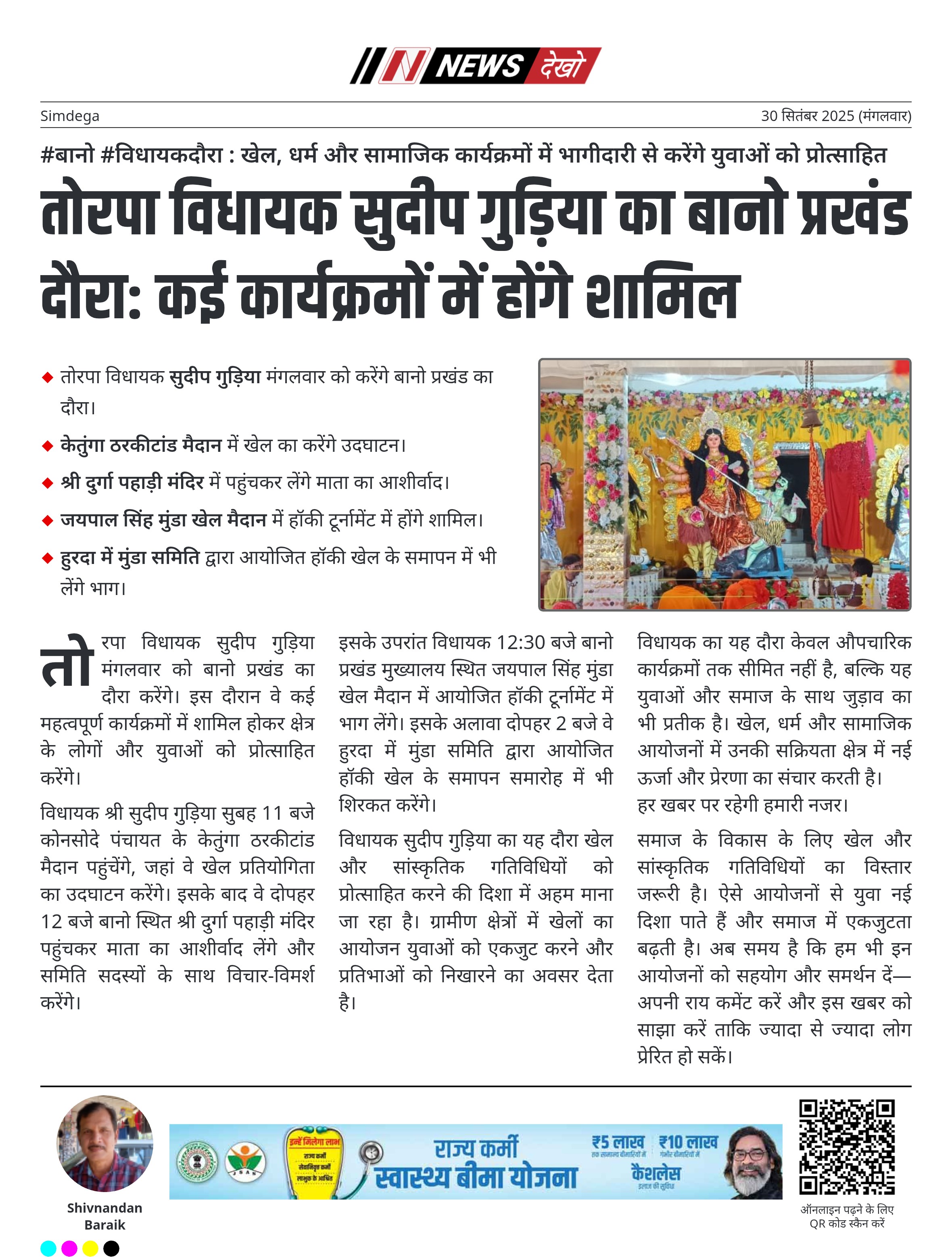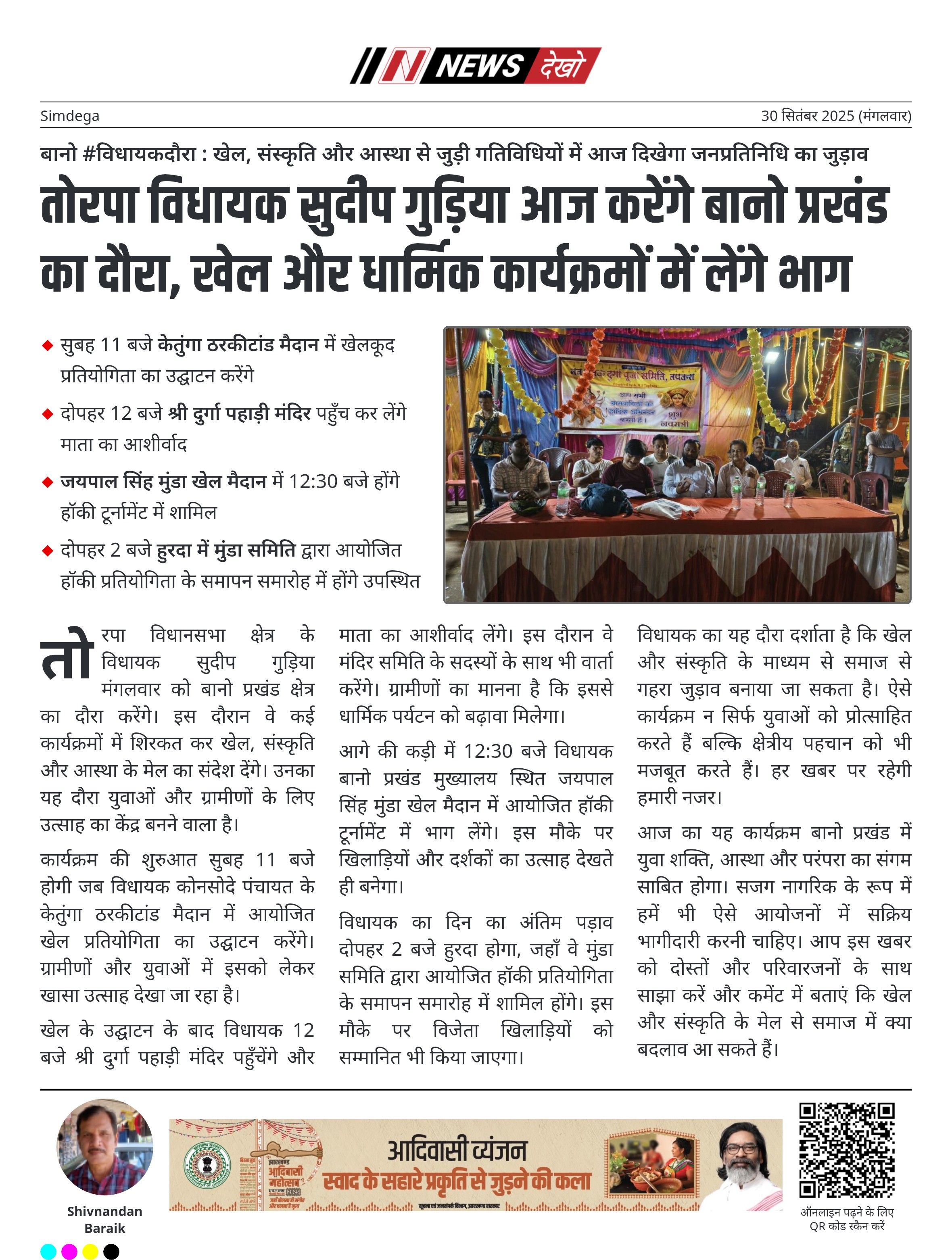 तोरपा विधायक सुदीप गुड़िया आज करेंगे बानो प्रखंड का दौरा, खेल और धार्मिक कार्यक्रमों में लेंगे भाग