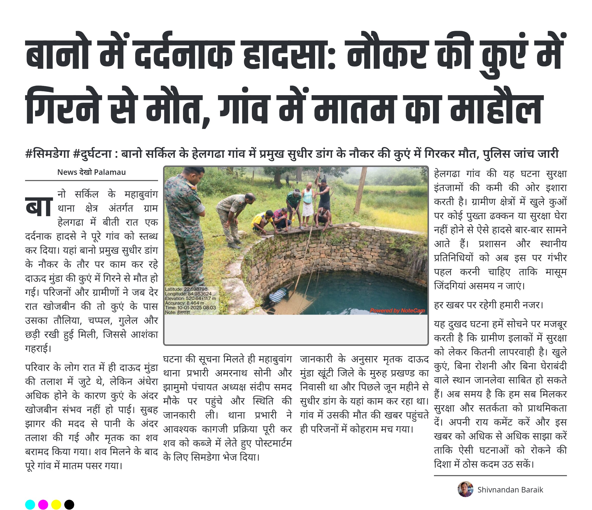 #सिमडेगा #दुर्घटना : बानो सर्किल के हेलगढा गांव में प्रमुख सुधीर डांग के नौकर की कुएं में गिरकर मौत, पुलिस जांच जारी हेलगढा गांव में कुएं में गिरने से दाऊद मुंडा की मौत। मृतक पिछले जून माह से बानो प्रमुख सुधीर डांग के यहां कर रहा था काम। घर न लौटने पर परिजनों ने खोजबीन की, कुएं के पास मिला तौलिया और चप्पल। सुबह झागर की मदद से पानी से निकाला गया शव। थाना प्रभारी अमरनाथ सोनी ने शव पोस्टमार्टम…
