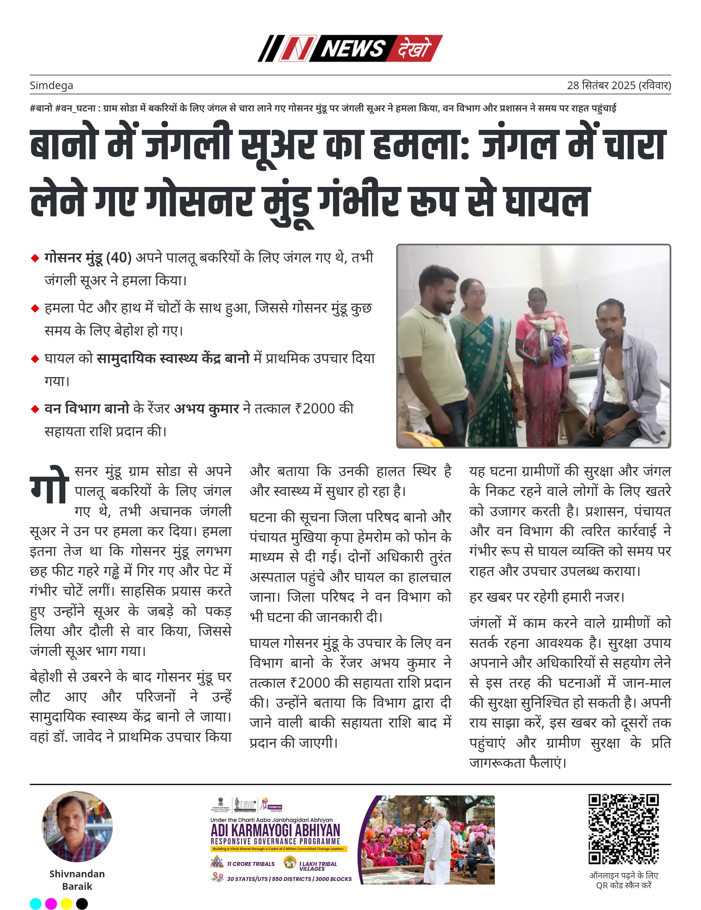 #बानो #वन_घटना : ग्राम सोडा में बकरियों के लिए जंगल से चारा लाने गए गोसनर मुंडू पर जंगली सूअर ने हमला किया, वन विभाग और प्रशासन ने समय पर राहत पहुंचाई गोसनर मुंडू (40) अपने पालतू बकरियों के लिए जंगल गए थे, तभी जंगली सूअर ने हमला किया। हमला पेट और हाथ में चोटों के साथ हुआ, जिससे गोसनर मुंडू कुछ समय के लिए बेहोश हो गए। साहस दिखाते हुए उन्होंने एक हाथ से सूअर के जबड़े को पकड़ा और…