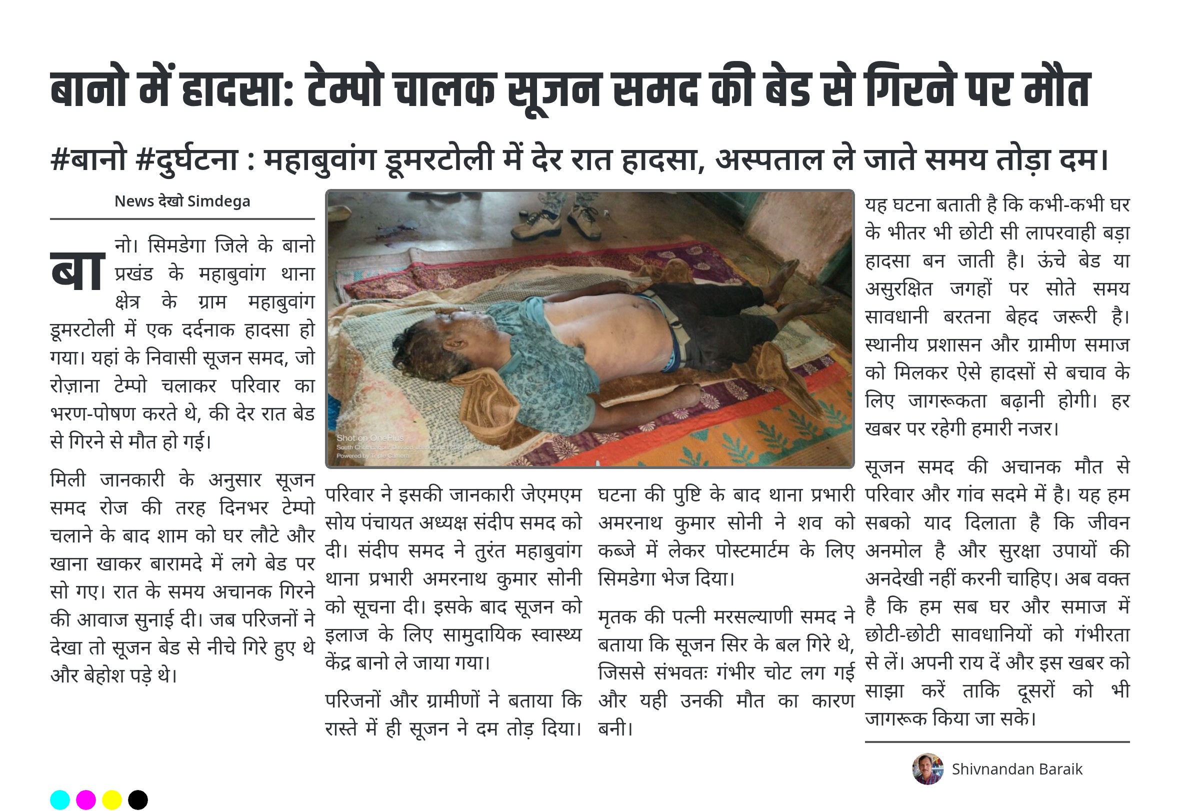#बानो #दुर्घटना : महाबुवांग डूमरटोली में देर रात हादसा, अस्पताल ले जाते समय तोड़ा दम। सूजन समद, टेम्पो चालक, बेड से गिरकर गंभीर रूप से घायल। घटना महाबुवांग डूमरटोली गांव की, रात में सोते समय हुआ हादसा। परिजनों ने संदीप समद को दी सूचना, फिर थाना प्रभारी को खबर। इलाज के लिए बानो सीएचसी ले जाया गया, रास्ते में ही मौत। शव को पोस्टमार्टम के लिए सिमडेगा भेजा गया। बानो। सिमडेगा जिले के बानो प्रखंड के महाबुवांग थाना क्षेत्र के…