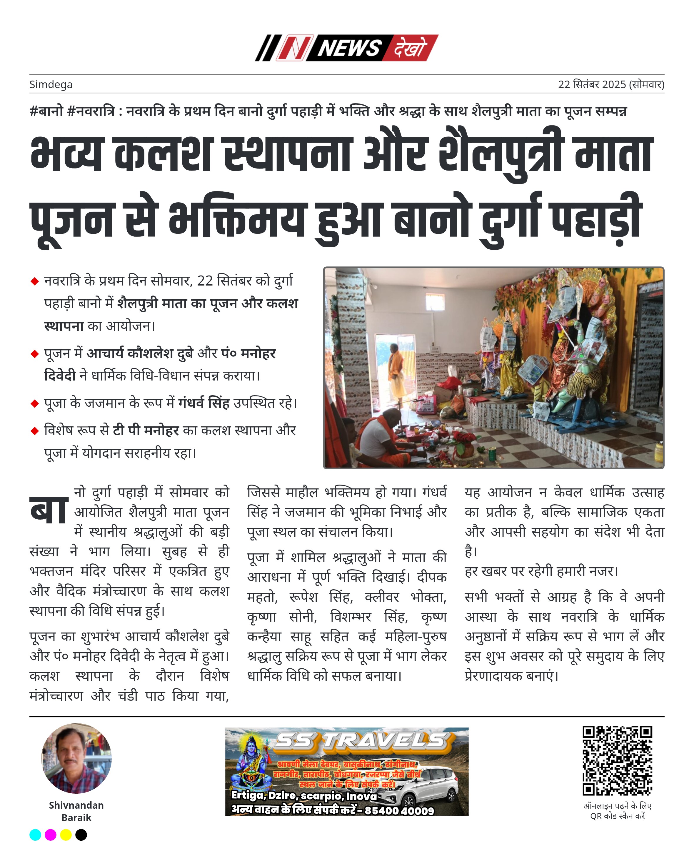 #बानो #नवरात्रि : नवरात्रि के प्रथम दिन बानो दुर्गा पहाड़ी में भक्ति और श्रद्धा के साथ शैलपुत्री माता का पूजन सम्पन्न नवरात्रि के प्रथम दिन सोमवार, 22 सितंबर को दुर्गा पहाड़ी बानो में शैलपुत्री माता का पूजन और कलश स्थापना का आयोजन। पूजन में आचार्य कौशलेश दुबे और पं० मनोहर दिवेदी ने धार्मिक विधि-विधान संपन्न कराया। पूजा के जजमान के रूप में गंधर्व सिंह उपस्थित रहे। प्रमुख भक्तों में दीपक महतो, रूपेश सिंह, क्लीवर भोक्ता, कृष्णा सोनी, विशम्भर सिंह, कृष्ण…