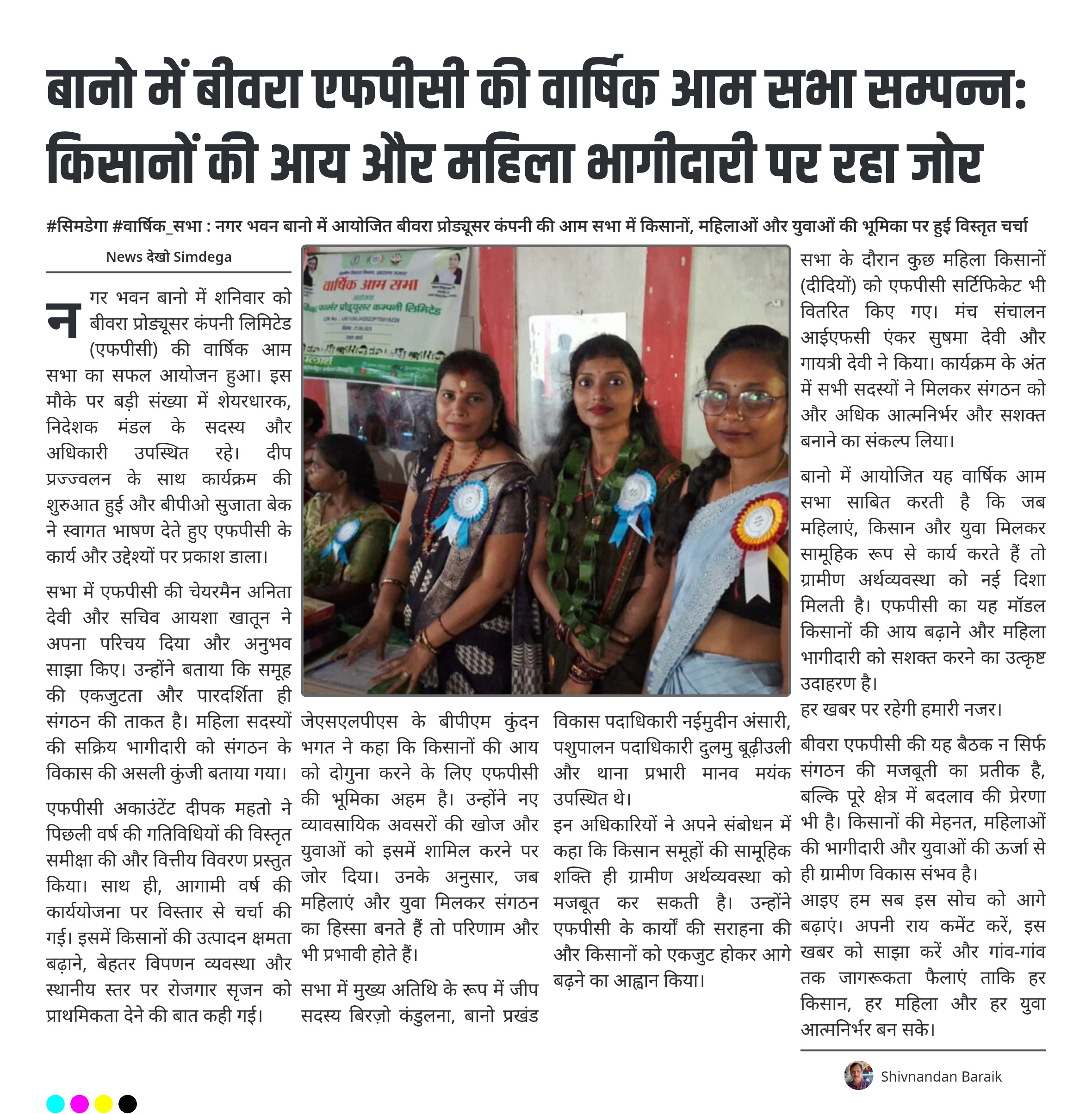 #सिमडेगा #वार्षिक_सभा : नगर भवन बानो में आयोजित बीवरा प्रोड्यूसर कंपनी की आम सभा में किसानों, महिलाओं और युवाओं की भूमिका पर हुई विस्तृत चर्चा नगर भवन बानो में बीवरा एफपीसी की वार्षिक आम सभा आयोजित हुई। चेयरमैन अनिता देवी और सचिव आयशा खातून ने अनुभव साझा किए। अकाउंटेंट दीपक महतो ने गतिविधियों व वित्तीय विवरण प्रस्तुत किया। बीपीएम कुंदन भगत ने किसानों की आय बढ़ाने और नए अवसरों पर चर्चा की। बीडीओ नईमुदीन अंसारी, थाना प्रभारी मानव मयंक समेत…