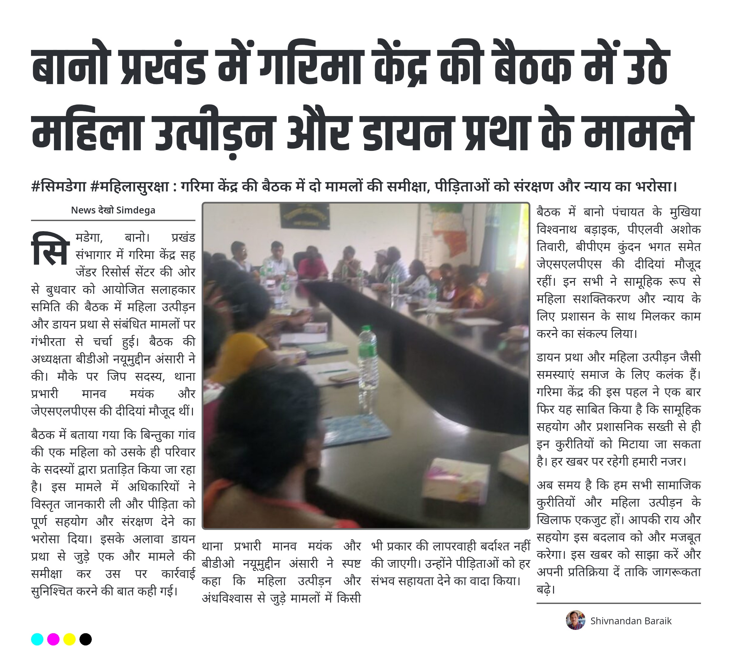 बानो प्रखंड में गरिमा केंद्र की बैठक में उठे महिला उत्पीड़न और डायन प्रथा के मामले