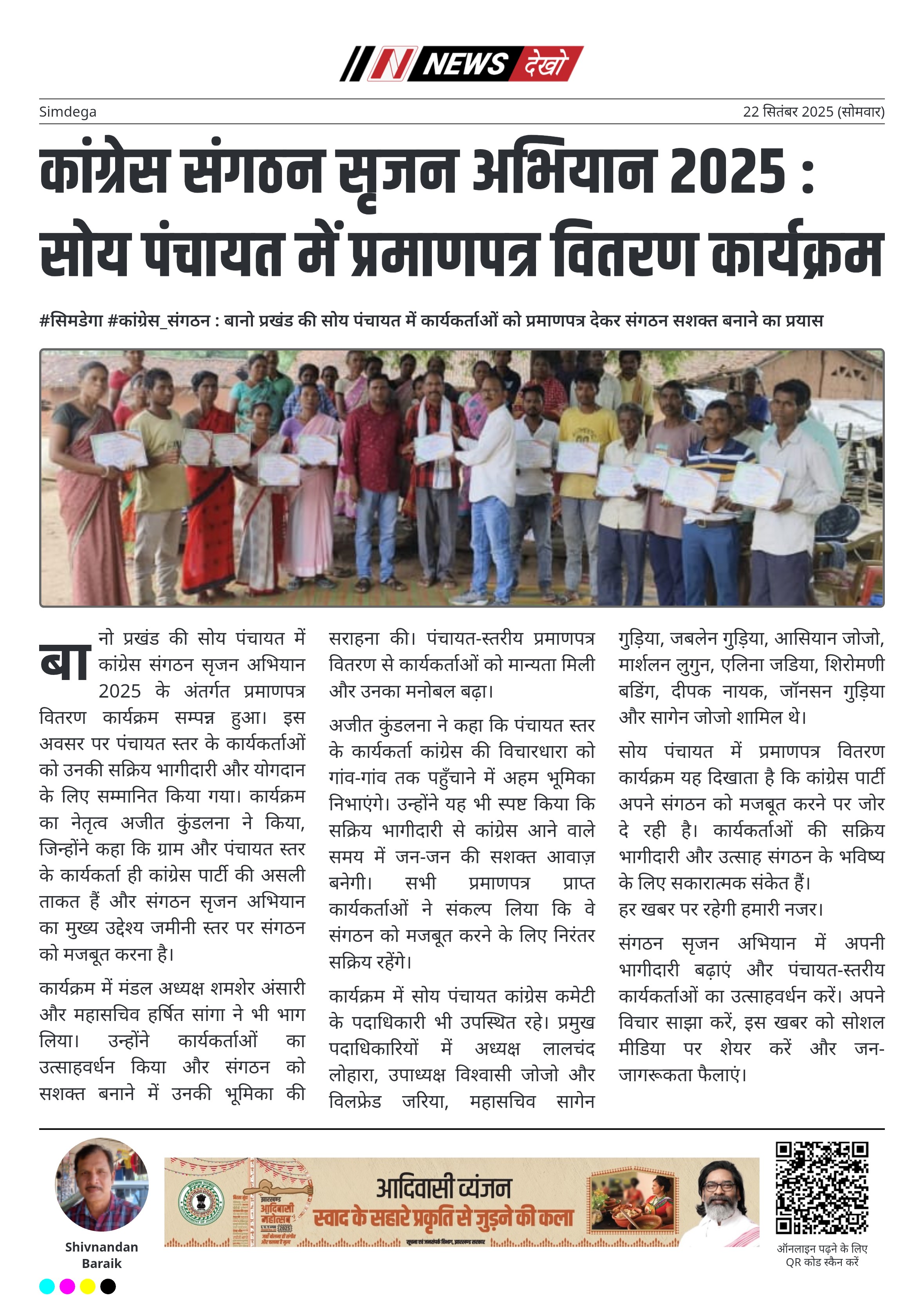 #सिमडेगा #कांग्रेस_संगठन : बानो प्रखंड की सोय पंचायत में कार्यकर्ताओं को प्रमाणपत्र देकर संगठन सशक्त बनाने का प्रयास बानो प्रखंड की सोय पंचायत में कांग्रेस संगठन सृजन अभियान 2025 के तहत प्रमाणपत्र वितरण कार्यक्रम सम्पन्न। कार्यक्रम का नेतृत्व बानो प्रखंड कांग्रेस अध्यक्ष और सांसद प्रतिनिधि अजीत कुंडलना ने किया। पंचायत स्तर के पदाधिकारी और सक्रिय कार्यकर्ताओं को संगठन सशक्त बनाने हेतु प्रमाणपत्र प्रदान किए गए। कार्यक्रम में मंडल अध्यक्ष शमशेर अंसारी और महासचिव हर्षित सांगा ने भाग लिया और कार्यकर्ताओं…