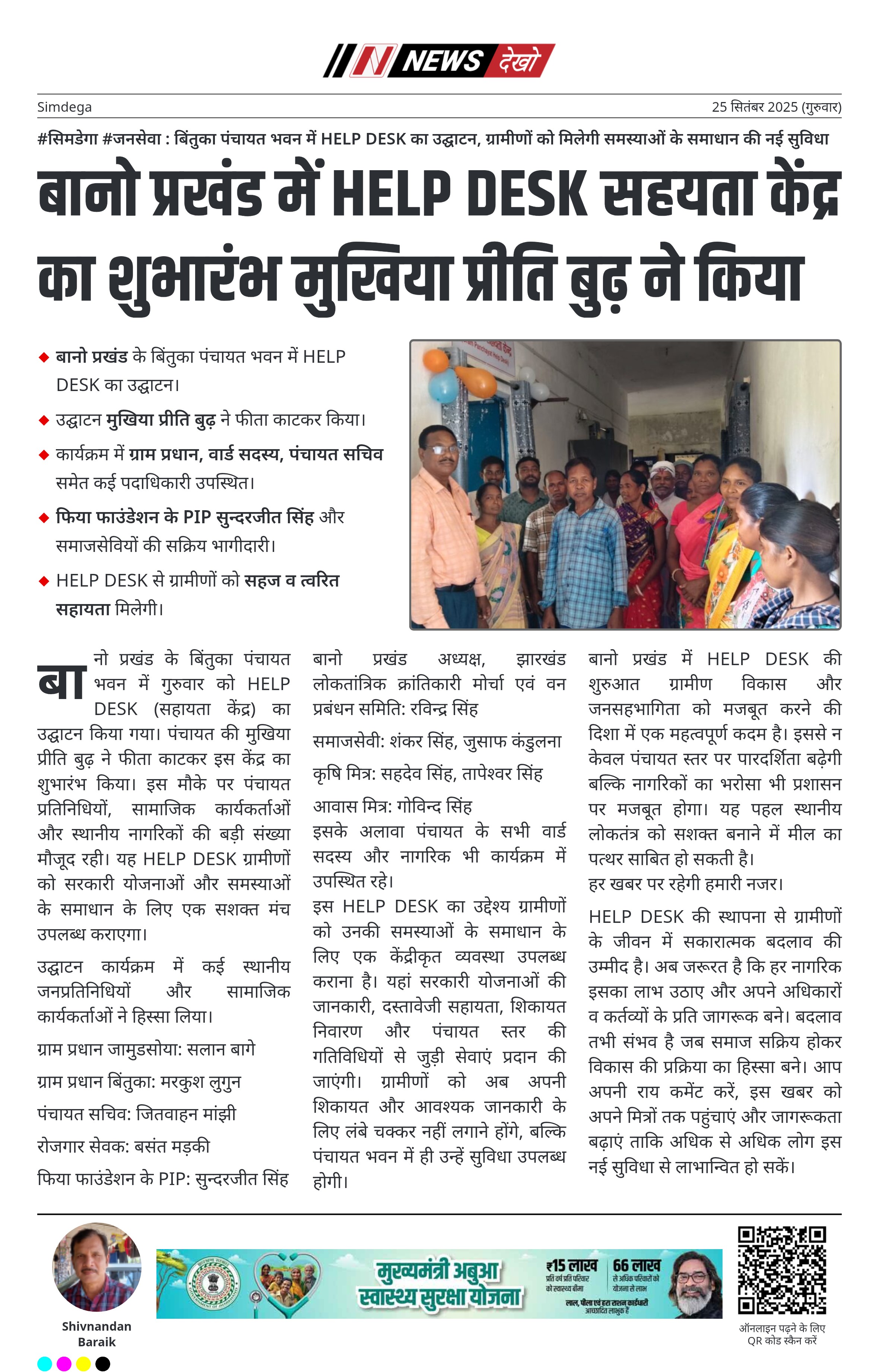 #सिमडेगा #जनसेवा : बिंतुका पंचायत भवन में HELP DESK का उद्घाटन, ग्रामीणों को मिलेगी समस्याओं के समाधान की नई सुविधा बानो प्रखंड के बिंतुका पंचायत भवन में HELP DESK का उद्घाटन। उद्घाटन मुखिया प्रीति बुढ़ ने फीता काटकर किया। कार्यक्रम में ग्राम प्रधान, वार्ड सदस्य, पंचायत सचिव समेत कई पदाधिकारी उपस्थित। फिया फाउंडेशन के PIP सुन्दरजीत सिंह और समाजसेवियों की सक्रिय भागीदारी। HELP DESK से ग्रामीणों को सहज व त्वरित सहायता मिलेगी। बानो प्रखंड के बिंतुका पंचायत भवन में गुरुवार…
