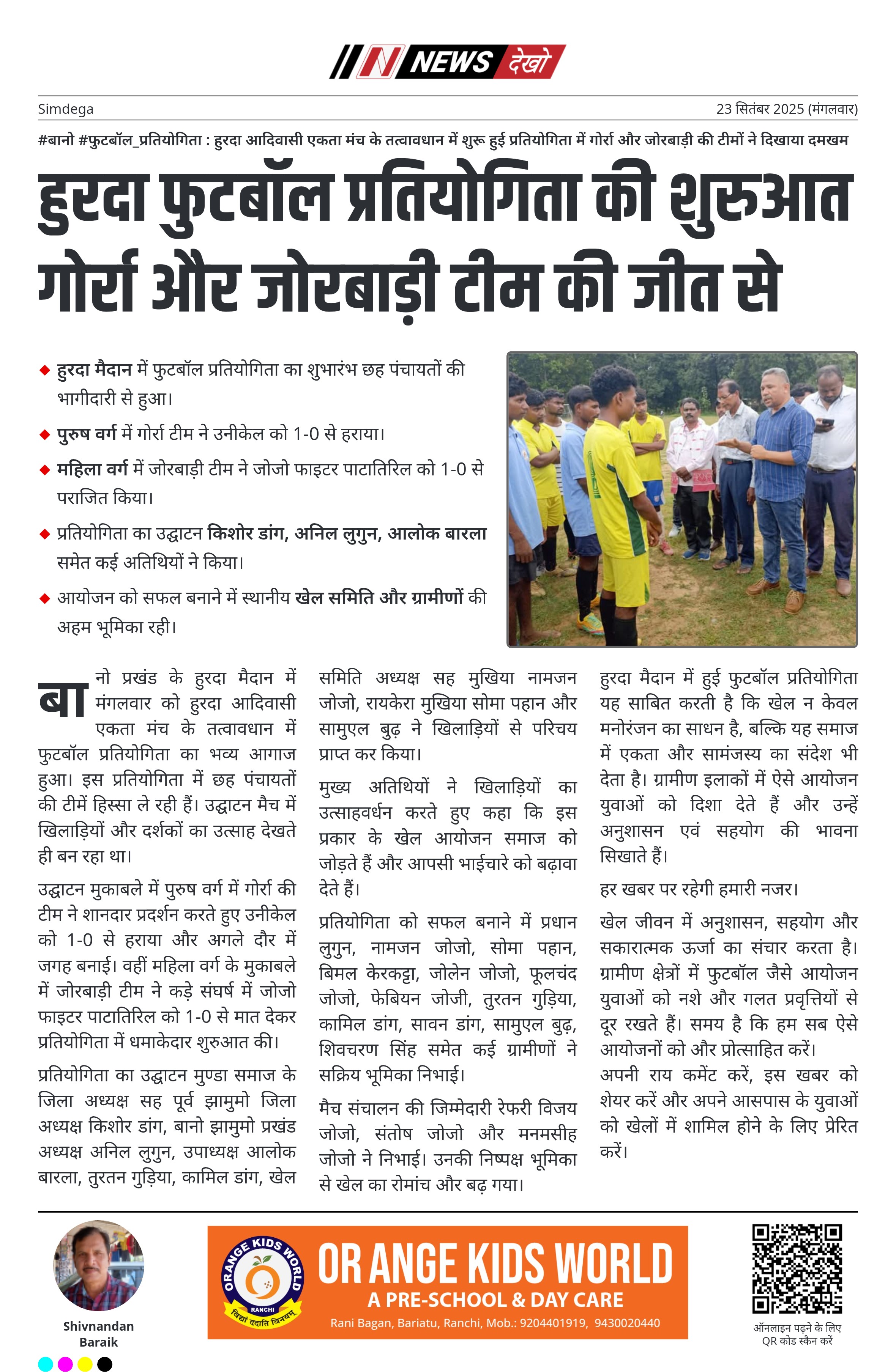 #बानो #फुटबॉल_प्रतियोगिता : हुरदा आदिवासी एकता मंच के तत्वावधान में शुरू हुई प्रतियोगिता में गोर्रा और जोरबाड़ी की टीमों ने दिखाया दमखम हुरदा मैदान में फुटबॉल प्रतियोगिता का शुभारंभ छह पंचायतों की भागीदारी से हुआ। पुरुष वर्ग में गोर्रा टीम ने उनीकेल को 1-0 से हराया। महिला वर्ग में जोरबाड़ी टीम ने जोजो फाइटर पाटातिरिल को 1-0 से पराजित किया। प्रतियोगिता का उद्घाटन किशोर डांग, अनिल लुगुन, आलोक बारला समेत कई अतिथियों ने किया। आयोजन को सफल बनाने में स्थानीय…