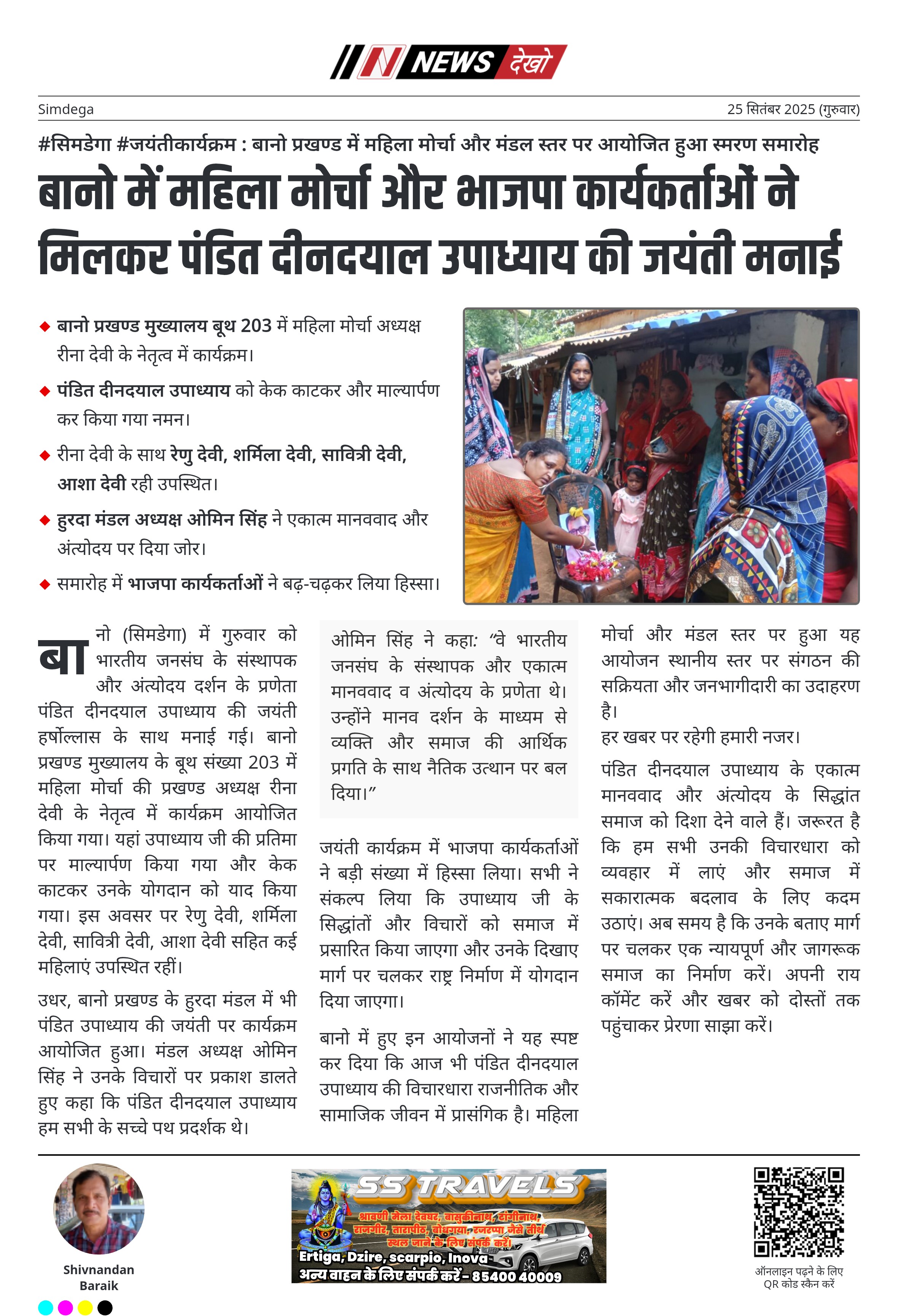 #सिमडेगा #जयंतीकार्यक्रम : बानो प्रखण्ड में महिला मोर्चा और मंडल स्तर पर आयोजित हुआ स्मरण समारोह बानो प्रखण्ड मुख्यालय बूथ 203 में महिला मोर्चा अध्यक्ष रीना देवी के नेतृत्व में कार्यक्रम। पंडित दीनदयाल उपाध्याय को केक काटकर और माल्यार्पण कर किया गया नमन। रीना देवी के साथ रेणु देवी, शर्मिला देवी, सावित्री देवी, आशा देवी रही उपस्थित। हुरदा मंडल अध्यक्ष ओमिन सिंह ने एकात्म मानववाद और अंत्योदय पर दिया जोर। समारोह में भाजपा कार्यकर्ताओं ने बढ़-चढ़कर लिया हिस्सा। बानो (सिमडेगा)…