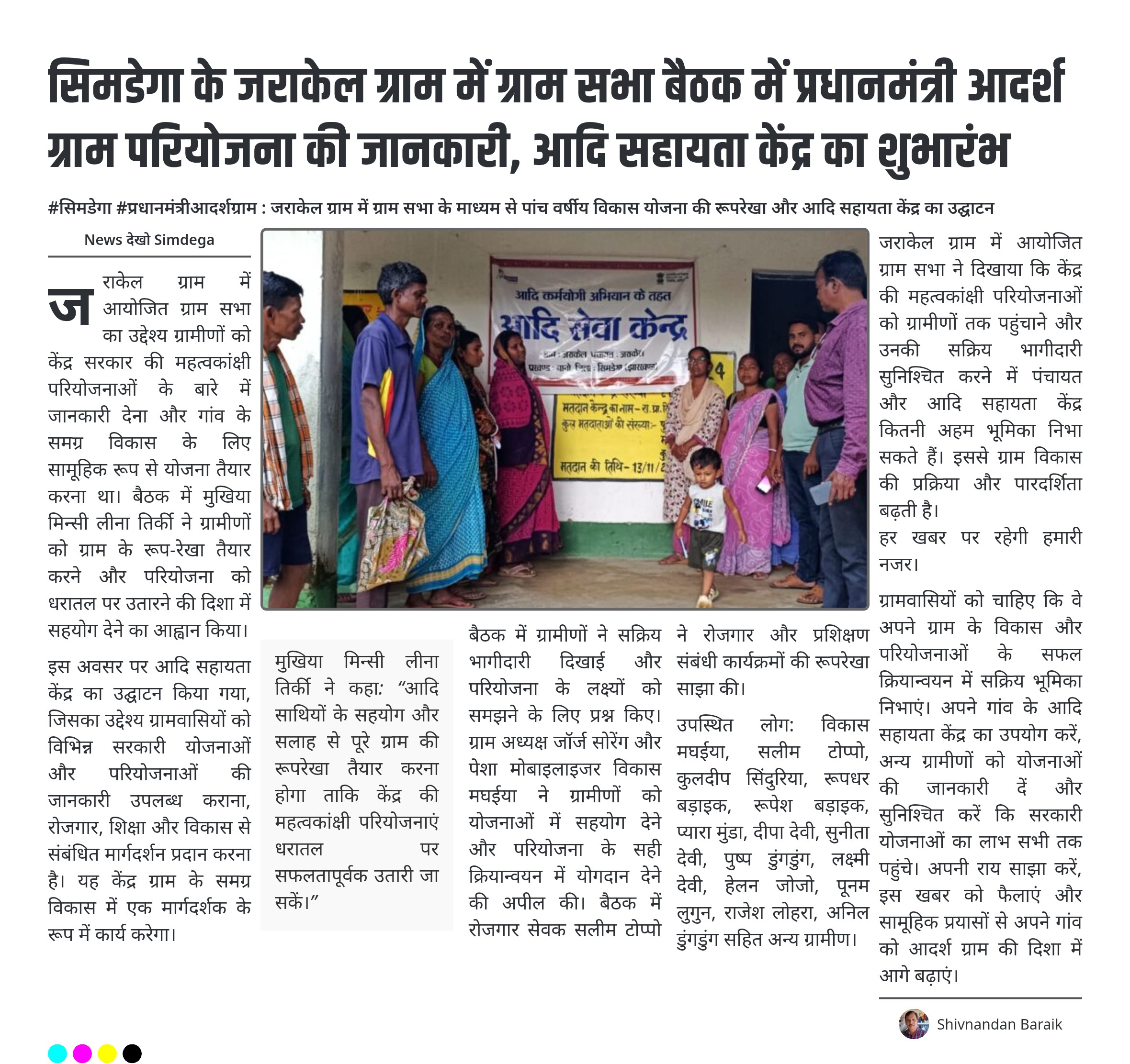 सिमडेगा के जराकेल ग्राम में ग्राम सभा बैठक में प्रधानमंत्री आदर्श ग्राम परियोजना की जानकारी, आदि सहायता केंद्र का शुभारंभ