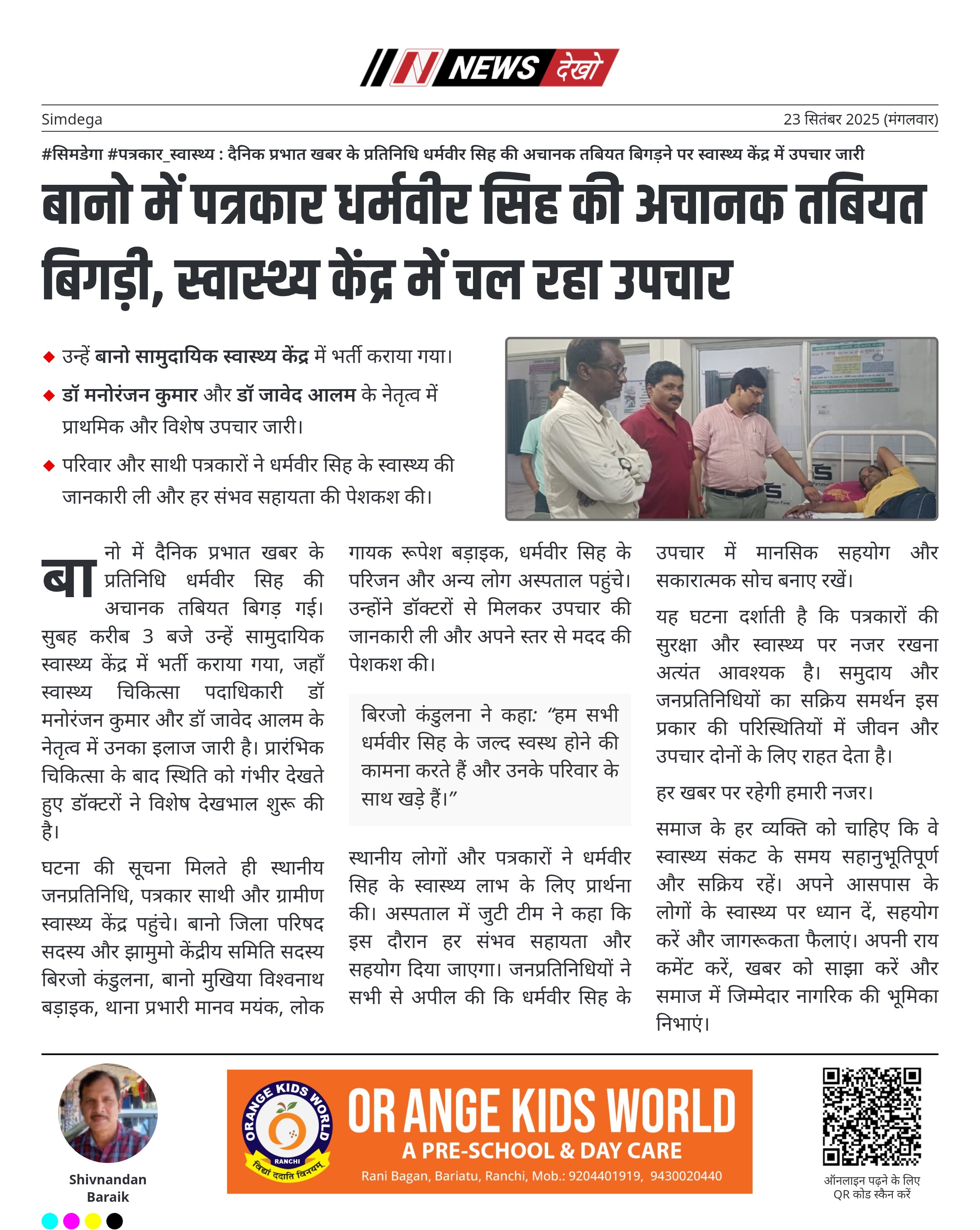 #सिमडेगा #पत्रकार_स्वास्थ्य : दैनिक प्रभात खबर के प्रतिनिधि धर्मवीर सिह की अचानक तबियत बिगड़ने पर स्वास्थ्य केंद्र में उपचार जारी दैनिक प्रभात खबर के पत्रकार धर्मवीर सिह की सुबह करीब 3 बजे अचानक तबियत बिगड़ी। उन्हें बानो सामुदायिक स्वास्थ्य केंद्र में भर्ती कराया गया। डॉ मनोरंजन कुमार और डॉ जावेद आलम के नेतृत्व में प्राथमिक और विशेष उपचार जारी। सूचना मिलने पर बानो जिला परिषद सदस्य बिरजो कंडुलना, मुखिया विश्वनाथ बड़ाइक, थाना प्रभारी मानव मयंक सहित स्थानीय जनप्रतिनिधि और लोग…