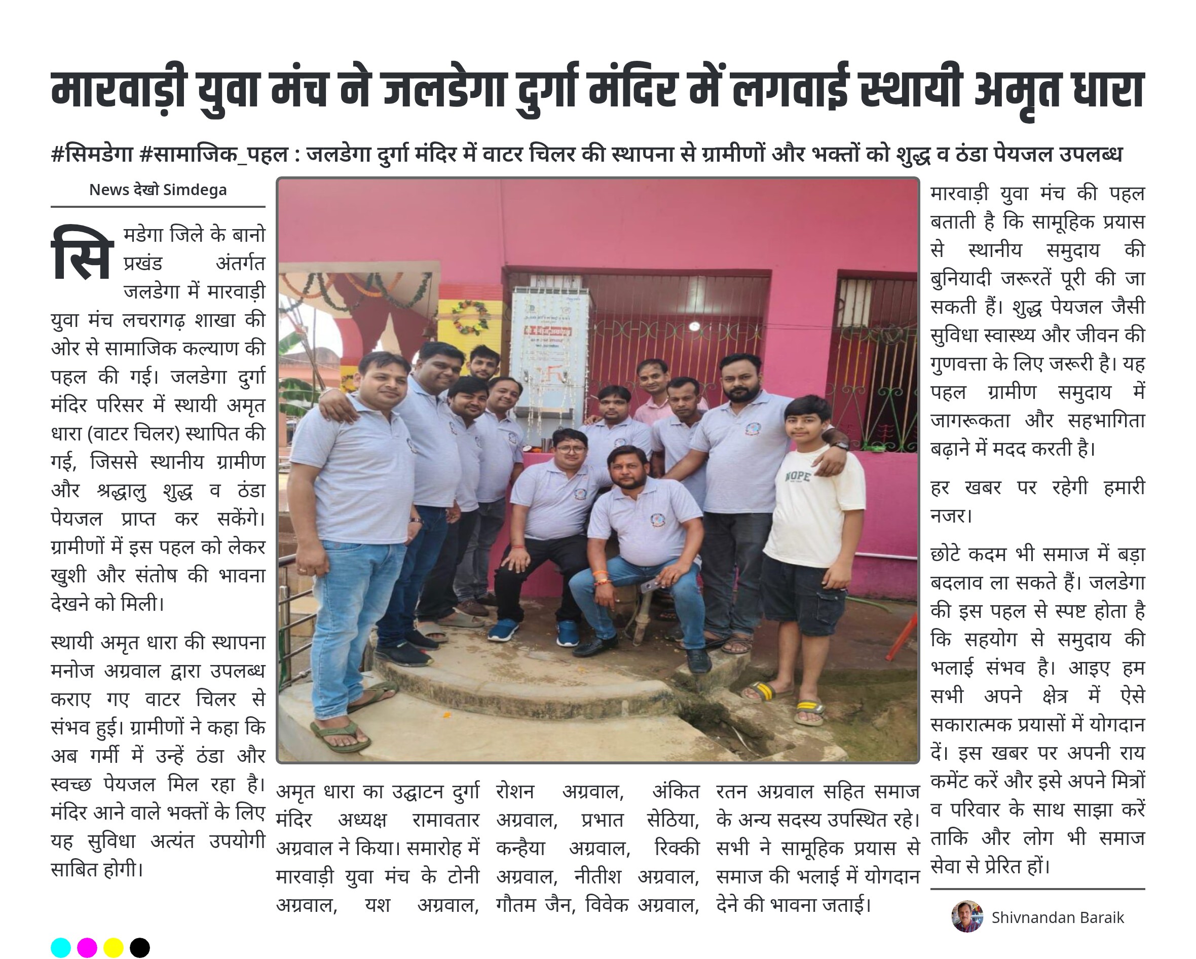 मारवाड़ी युवा मंच ने जलडेगा दुर्गा मंदिर में लगवाई स्थायी अमृत धारा