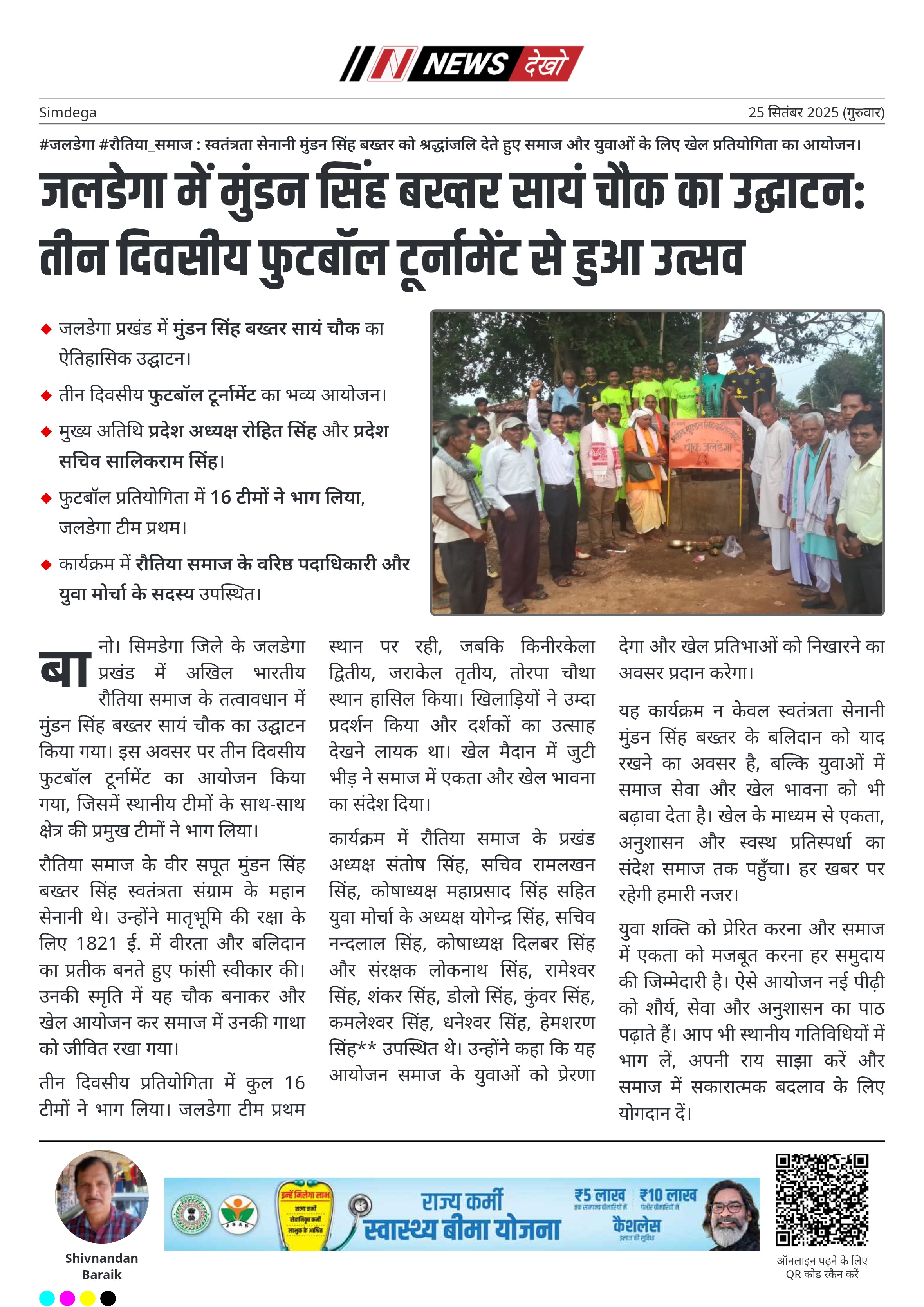 #जलडेगा #रौतिया_समाज : स्वतंत्रता सेनानी मुंडन सिंह बख्तर को श्रद्धांजलि देते हुए समाज और युवाओं के लिए खेल प्रतियोगिता का आयोजन। जलडेगा प्रखंड में मुंडन सिंह बख्तर सायं चौक का ऐतिहासिक उद्घाटन। तीन दिवसीय फुटबॉल टूर्नामेंट का भव्य आयोजन। मुख्य अतिथि प्रदेश अध्यक्ष रोहित सिंह और प्रदेश सचिव सालिकराम सिंह। फुटबॉल प्रतियोगिता में 16 टीमों ने भाग लिया, जलडेगा टीम प्रथम। कार्यक्रम में रौतिया समाज के वरिष्ठ पदाधिकारी और युवा मोर्चा के सदस्य उपस्थित। बानो। सिमडेगा जिले के जलडेगा प्रखंड…
