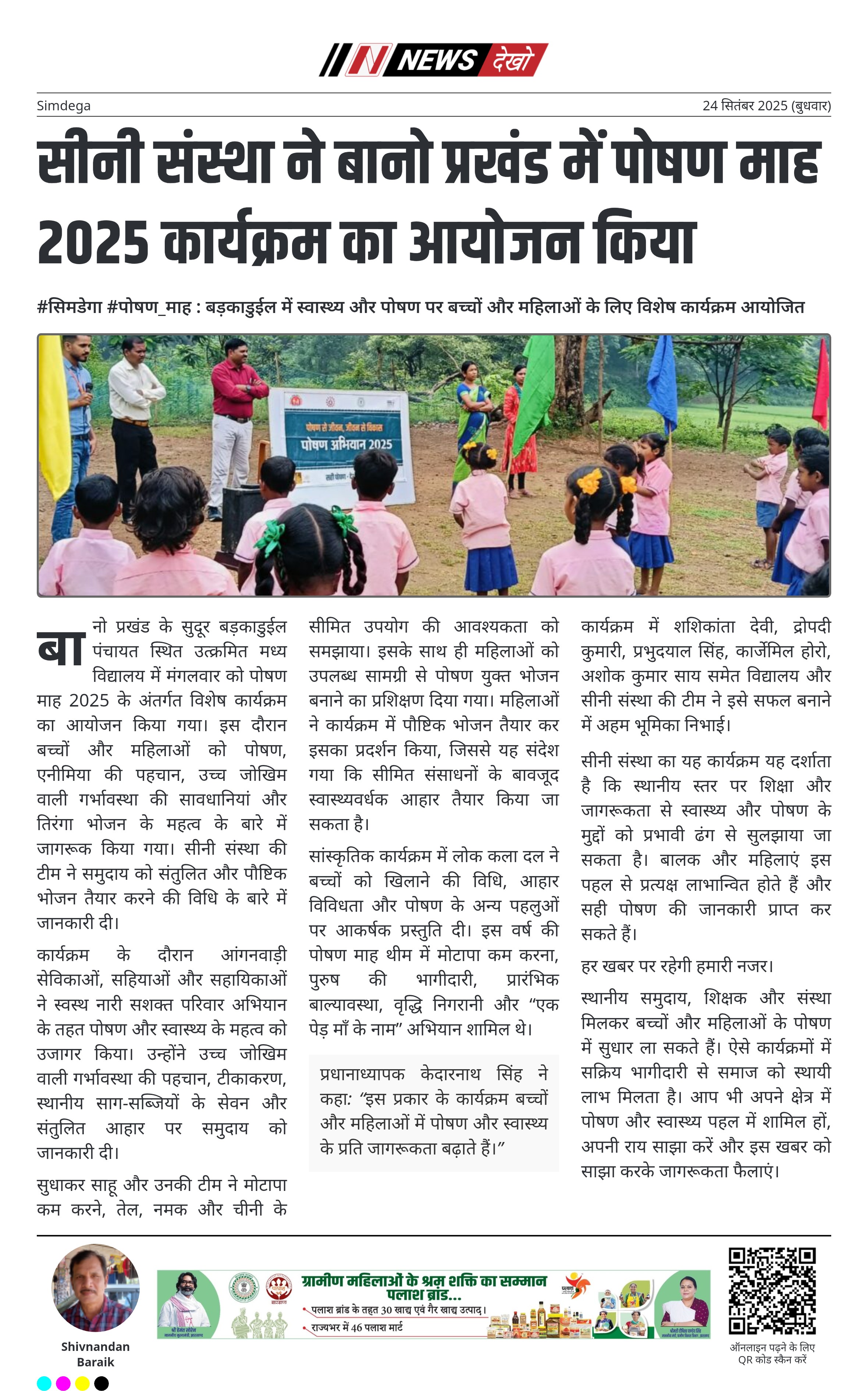 #सिमडेगा #पोषण_माह : बड़काडुईल में स्वास्थ्य और पोषण पर बच्चों और महिलाओं के लिए विशेष कार्यक्रम आयोजित सीनी संस्था ने बानो प्रखंड के बड़काडुईल पंचायत में पोषण माह 2025 का आयोजन किया। स्वस्थ नारी सशक्त परिवार अभियान के तहत एनीमिया, गर्भावस्था टीकाकरण और पोषण के महत्व पर जानकारी दी गई। सीनी जीवन परियोजना के सुधाकर साहू और टीम ने मोटापा कम करने, तेल, नमक और चीनी के सीमित उपयोग की जानकारी साझा की। महिलाएं पौष्टिक भोजन तैयार कर समुदाय को…